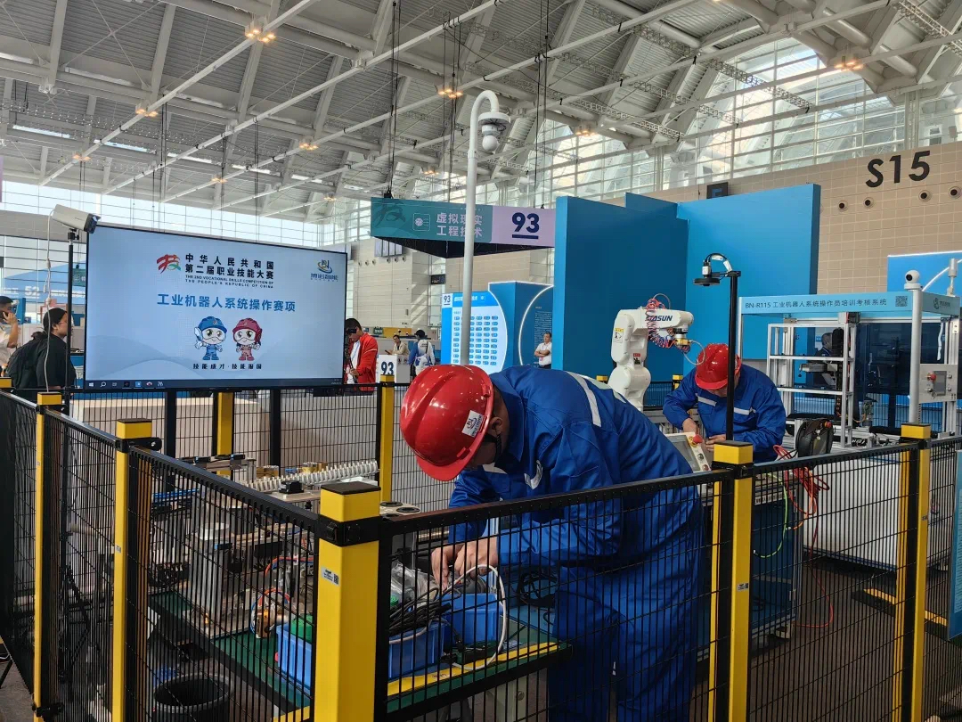 9月中旬,国家会展中心(天津),工业机器人系统操作赛项吸引了不少观众围观。来自天津机电职业技术学院的袁海亮和搭档何琳锋围着一台工业机器人忙前忙后。他们一会儿盯着电脑写下一串串代码,一会儿又跑到工业控制器前调整测试……很快,机器人开始挥舞双臂,精准完成自动送料、定位抓取等动作。