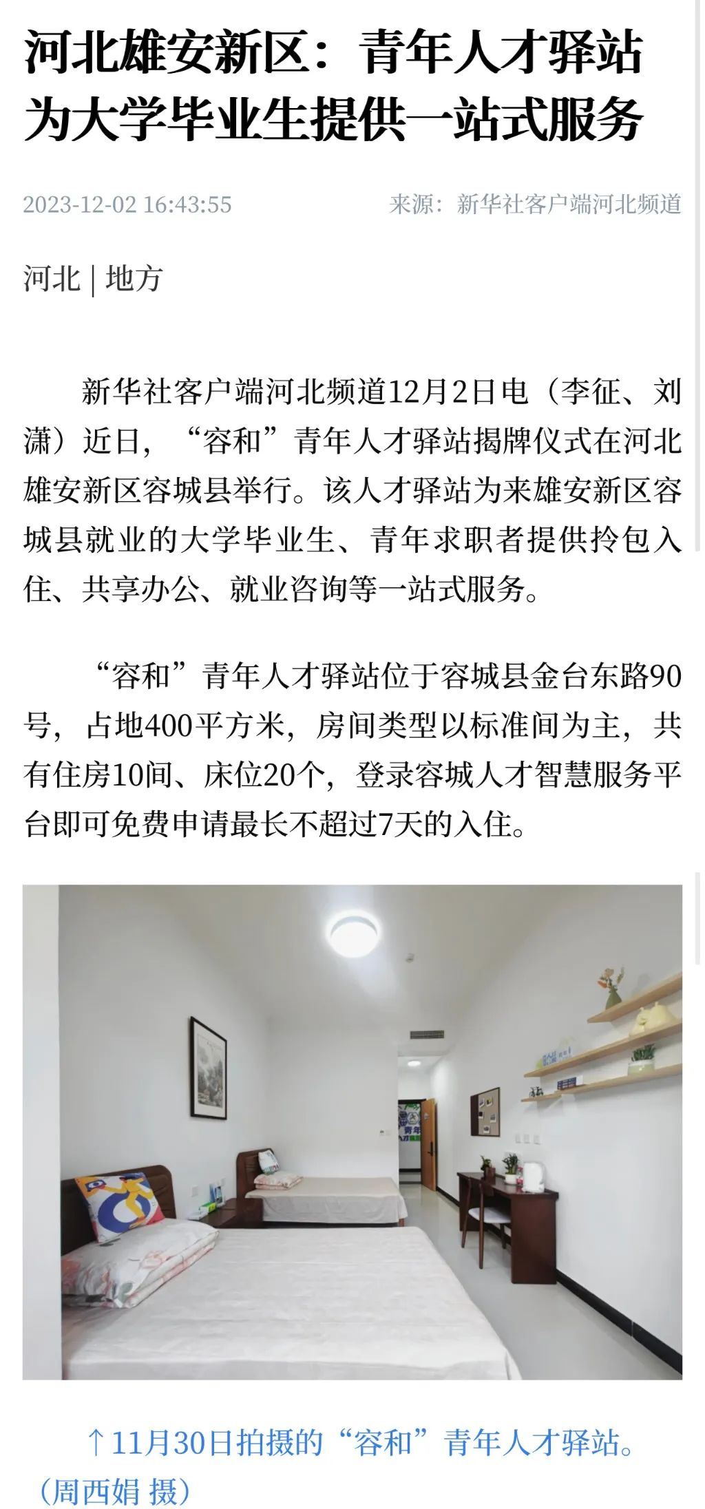新华社客户端刊发《河北雄安新区:青年人才驿站为大学毕业生提供一站式服务》。报道了“容和”青年人才驿站揭牌仪式在河北雄安新区容城县举行。该人才驿站为来雄安新区容城县就业的大学毕业生、青年求职者提供拎包入住、共享办公、就业咨询等一站式服务。