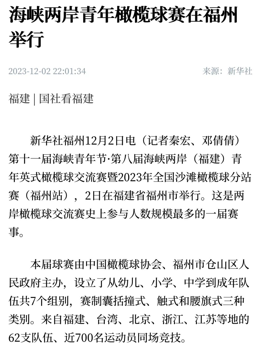 新华社客户端刊发《海峡两岸青年橄榄球赛在福州举行》。报道了第十一届海峡青年节·第八届海峡两岸(福建)青年英式橄榄球交流赛暨2023年全国沙滩橄榄球分站赛(福州站),2日在福建省福州市举行。这是两岸橄榄球交流赛史上参与人数规模最多的一届赛事。