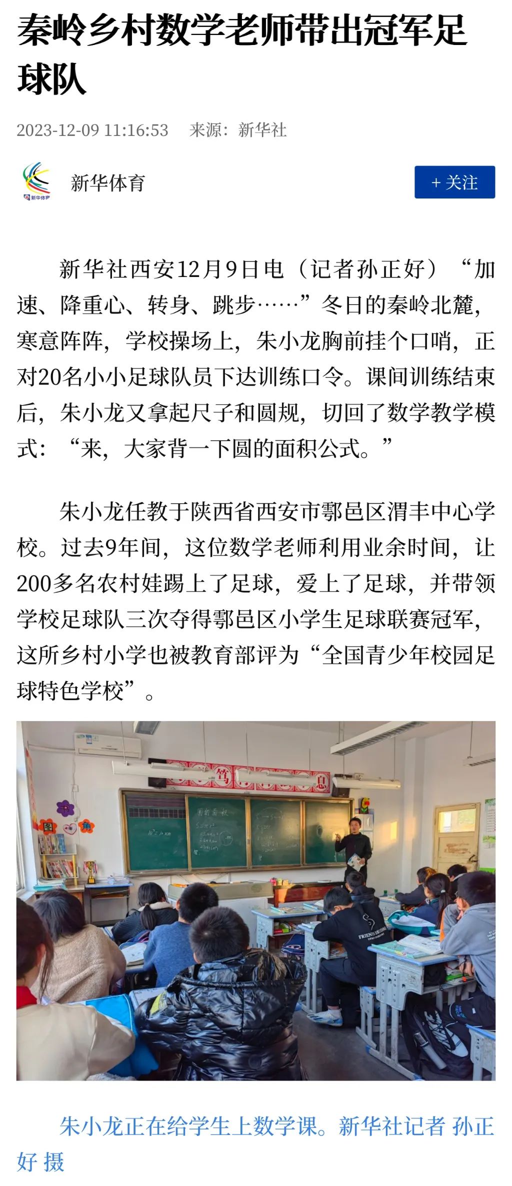 报道了过去9年间,任教于陕西省西安市鄠邑区渭丰中心学校的数学老师朱小龙,利用业余时间,让200多名农村娃踢上了足球,爱上了足球,并带领学校足球队三次夺得鄠邑区小学生足球联赛冠军。