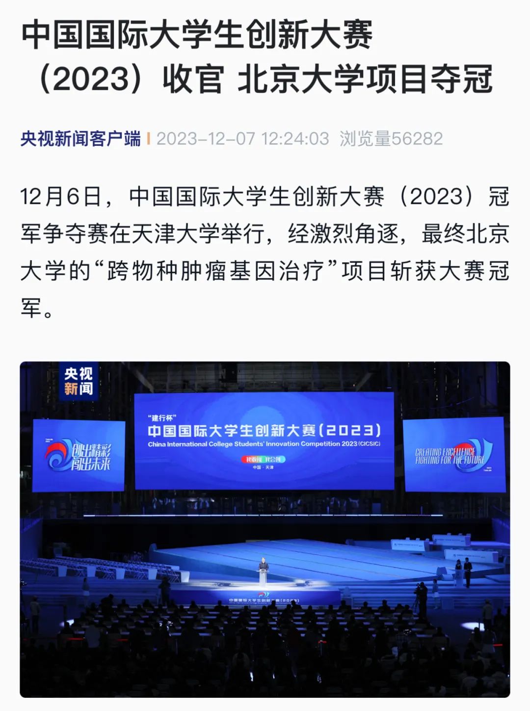 报道了12月6日,中国国际大学生创新大赛(2023)冠军争夺赛在天津大学举行,经激烈角逐,最终北京大学的“跨物种肿瘤基因治疗”项目斩获大赛冠军。