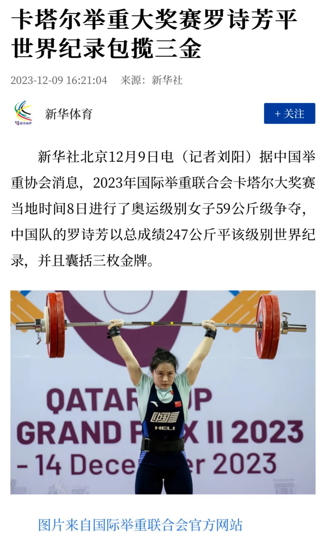 报道了2023年国际举重联合会卡塔尔大奖赛当地时间8日进行了奥运级别女子59公斤级争夺,中国队的“00后”罗诗芳以总成绩247公斤平该级别世界纪录,并且囊括三枚金牌。