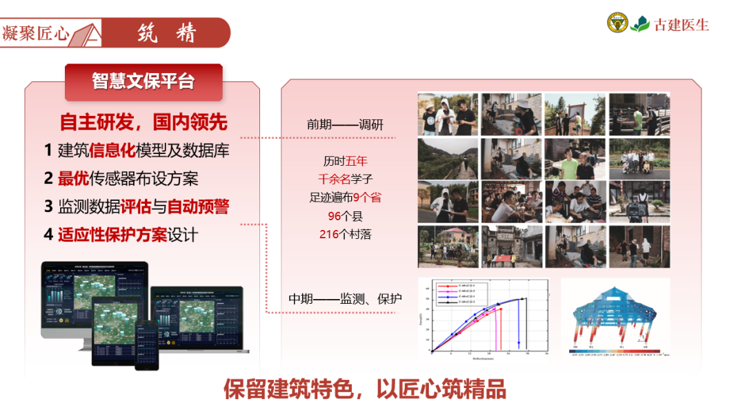 以“智慧文保平台”为抓手,通过前期调研、测绘了解现状;中期布置传感器动态监测当地古建情况,提供修缮保护方案,保留建筑特色,做到“匠心筑精品”。