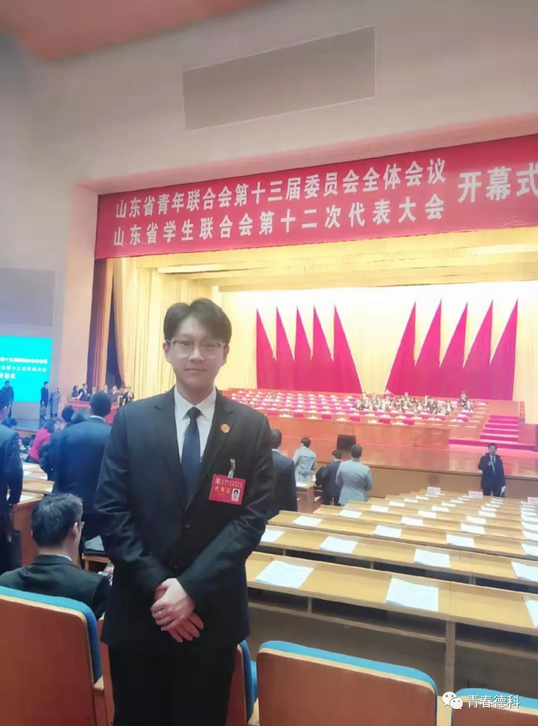 为深入学习贯彻习近平新时代中国特色社会主义思想和党的十九届四中全会精神,团结带领广大青年和青年学生为建设新时代现代化强省、实现中华民族伟大复兴中国梦努力奋斗。2019年12月17日,山东省学生联合会第十二次代表大会在山东大厦山东会堂召开。省委书记刘家义致信祝贺大会召开,省委副书记杨东奇出席会议并讲话。我校孔德辰同学作为正式代表,校团委书记孙强强作为列席代表出席省学联第十二次代表大会。