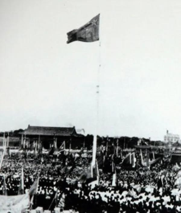 1949年10月1日,北京天安门广场举行隆重开国大典,毛泽东主席在天安门城楼上,亲手揿动电钮,升起了新中国第一面五星红旗,全场30万群众一片欢腾。
