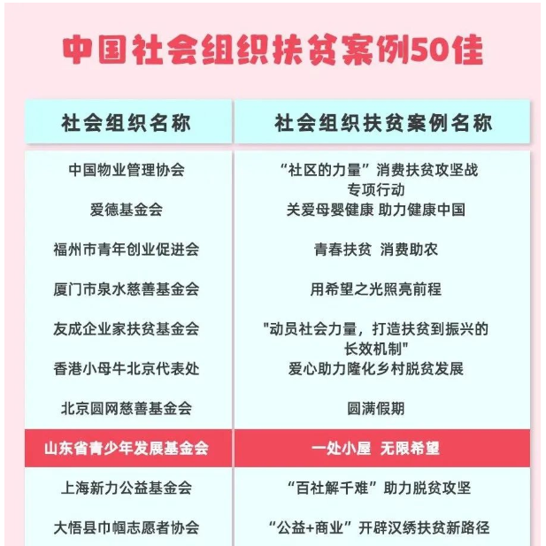 近日,国务院扶贫办社会扶贫司开展了社会组织扶贫案例研究项目。经过初审、专家评审等环节,最终评选出“社会组织扶贫案例50佳”,并进行公示。在这份名单中,“希望小屋”儿童关爱项目成功入围。