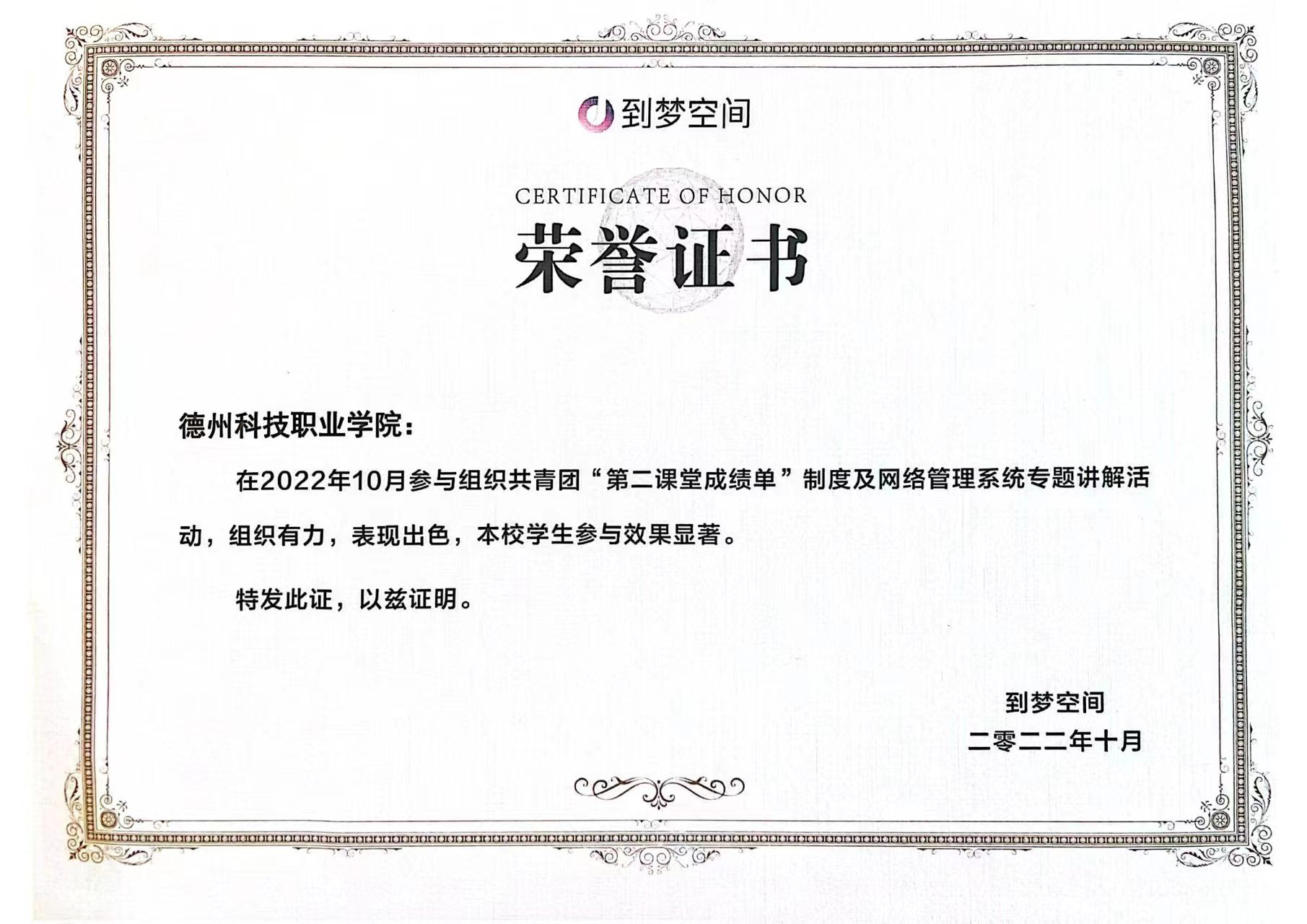 德州科技职业学院在2022年10月参与组织共青团“第二课堂成绩单”制度及网络管理系统专题讲解活动中,组织有力,表现出色,本校学生参与效果显著,被颁发荣誉证书。