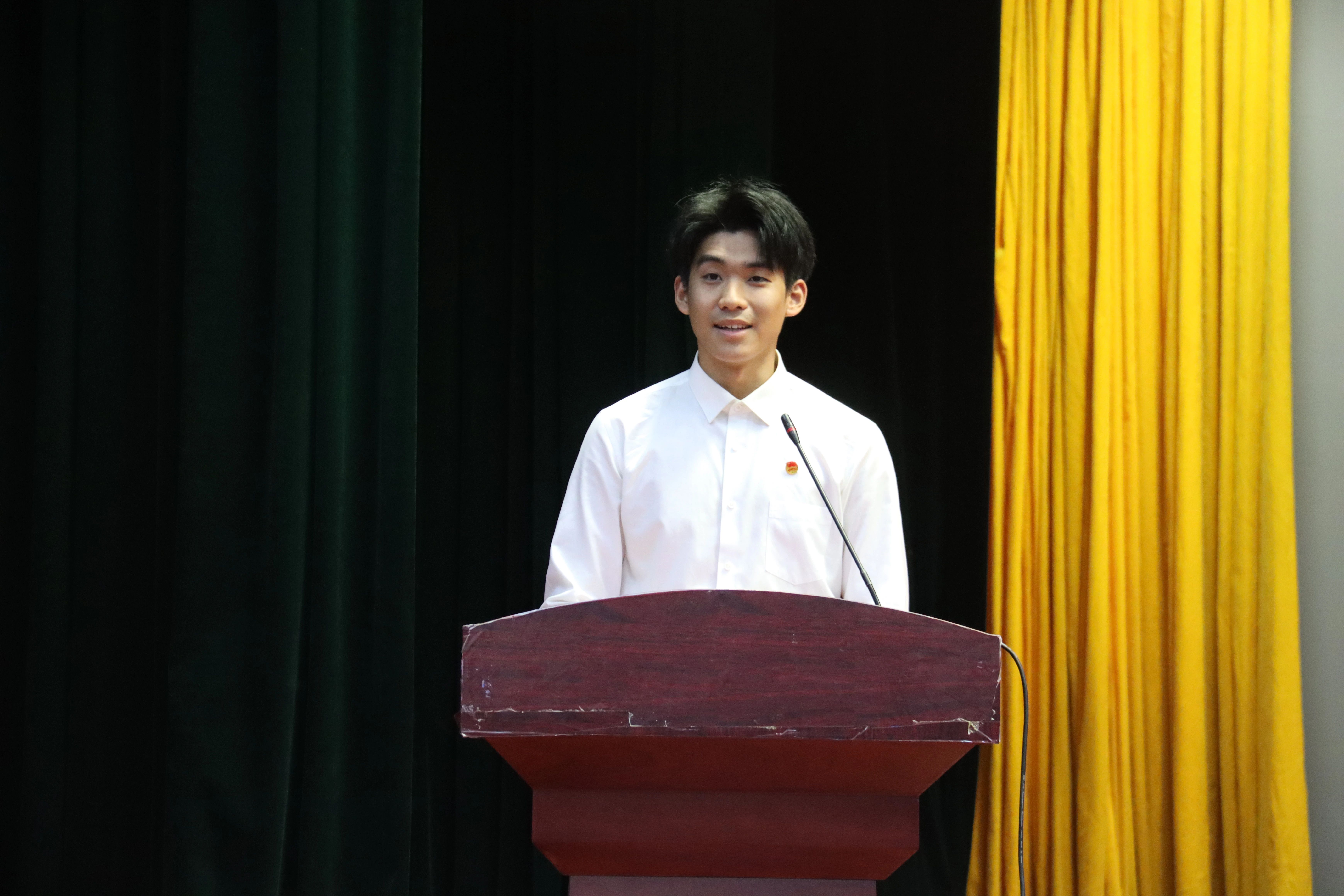 “优秀共青团员”代表王世界以“信念、勤学、担当”为成长坐标,讲述了自己从懵懂学子成长为青年榜样的心路历程。他呼吁同学们秉持“厚德、笃学、砺能、创新”的校训精神,将个人理想融入国家发展洪流,在时代浪潮中激扬青春,共筑民族复兴的壮阔梦想。