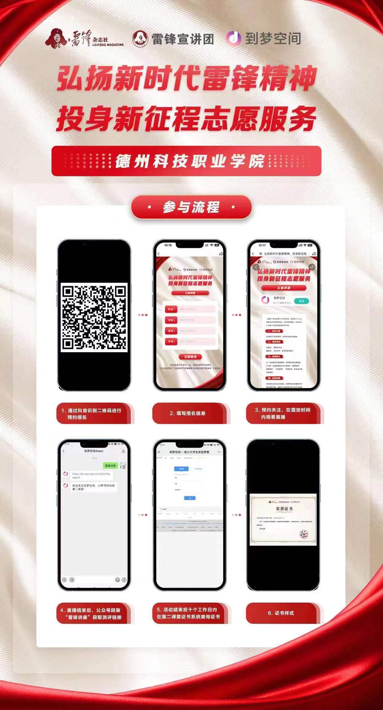 为深入学习贯彻习近平总书记关于弘扬雷锋精神的重要论述和重要指示精神,深刻把握雷锋精神的时代内涵,更好发挥青年团员模范带头作用,不断发展壮大学雷锋志愿服务队伍,让学雷锋在人民群众特别是青少年中蔚然成风,让学雷锋活动融入日常、化作经常,让雷锋精神在新时代绽放更加璀璨的光芒,为全面建设社会主义现代化国家、全面推进中华民族伟大复兴凝聚强大力量。团委将开展德州科技职业学院2023年“弘扬新时代雷锋精神,投身新征程志愿服务”公益讲座。现将相关事宜通知如下: