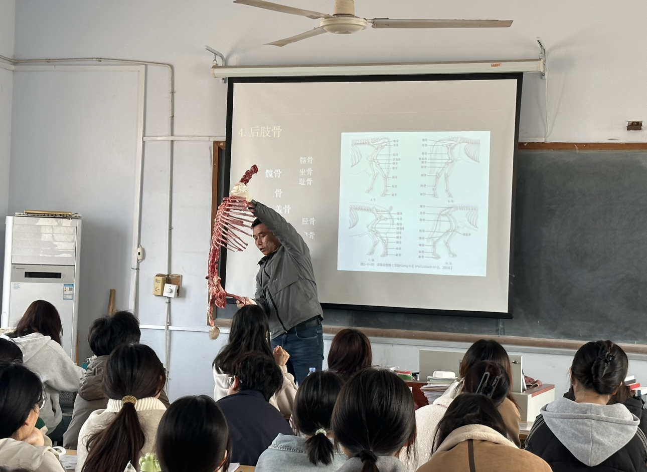 乡村振兴学院(五年制大专部)24宠医爱国班的《动物解剖学》课堂上出现了新奇一幕,秦清波老师拎着羊排走进教室,准备进行实地讲解。