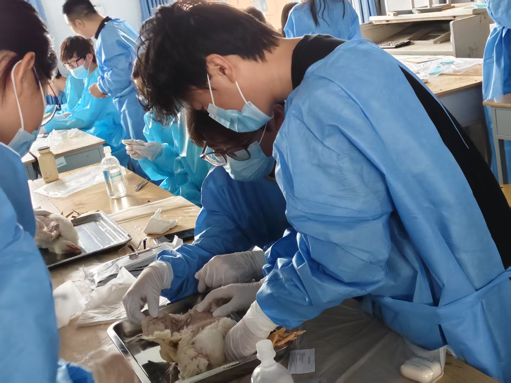 课程伊始,专业教师围绕禽类解剖要点进行理论讲解,从羽毛、皮肤结构,到肌肉分布、内脏器官位置,结合防疫检疫需求,强调解剖精准度对疫病诊断、样本采集的重要性,融入《动物防疫与检疫》等跨学科知识。实操环节,学生分组协作,严格遵循 “器械消毒 - 体表观察 - 逐层解剖 - 器官识别 - 标本处理” 流程,借助解剖工具,精准分离组织,识别心脏、肝脏等器官,将《动物解剖学》理论转化为实操能力,同时模拟防疫检疫场景,练习从解剖样本中规范采集检测素材。