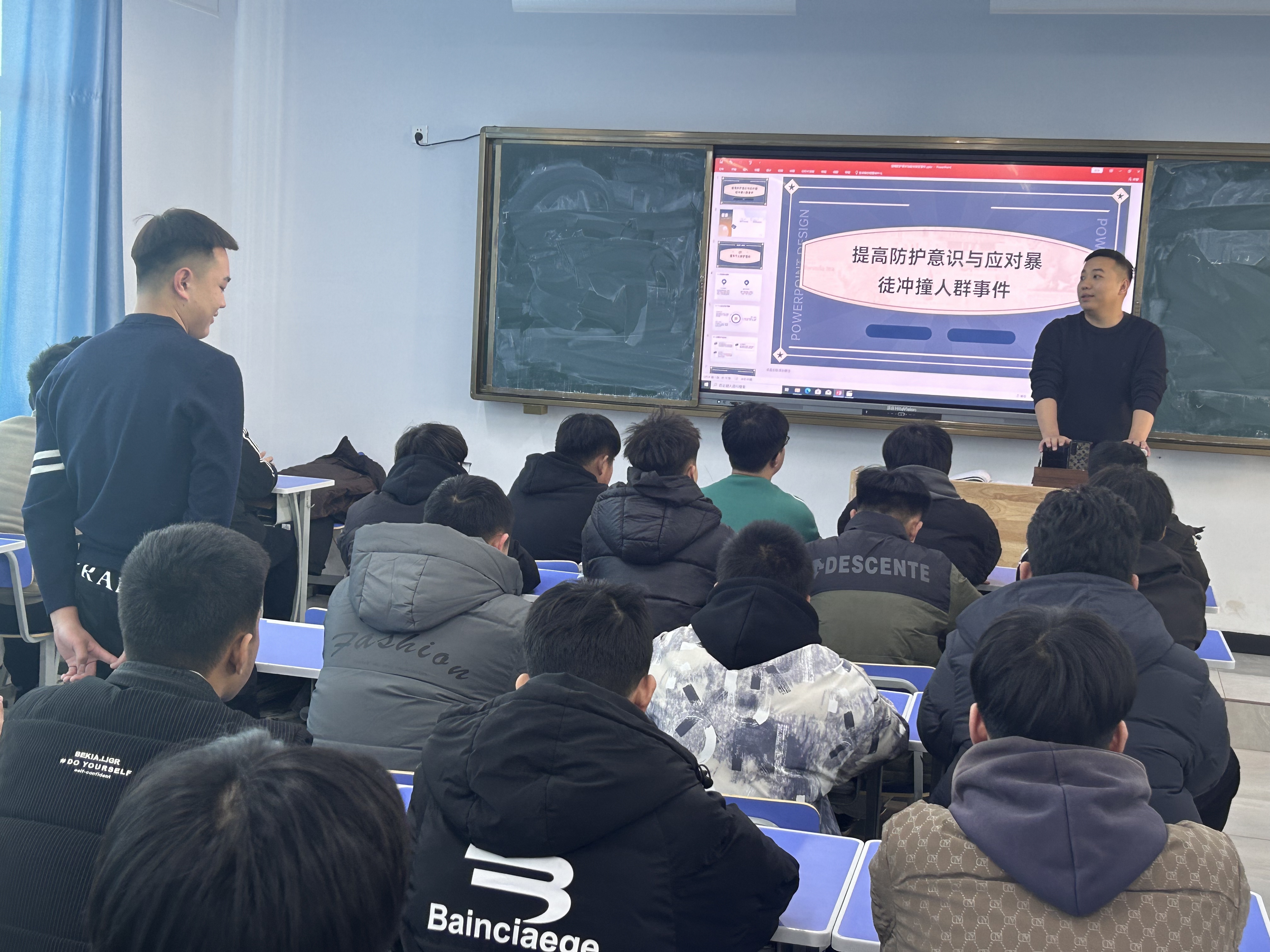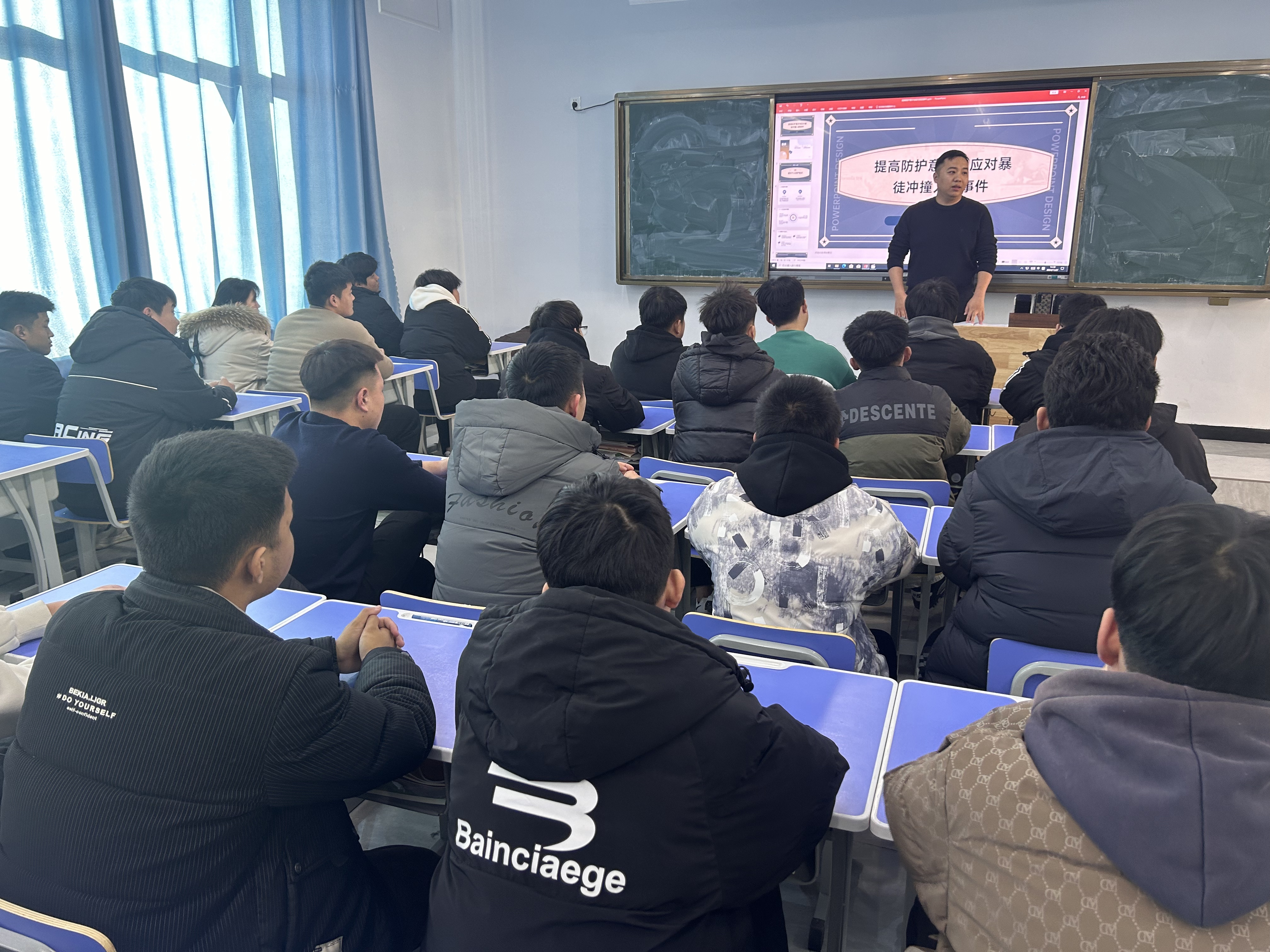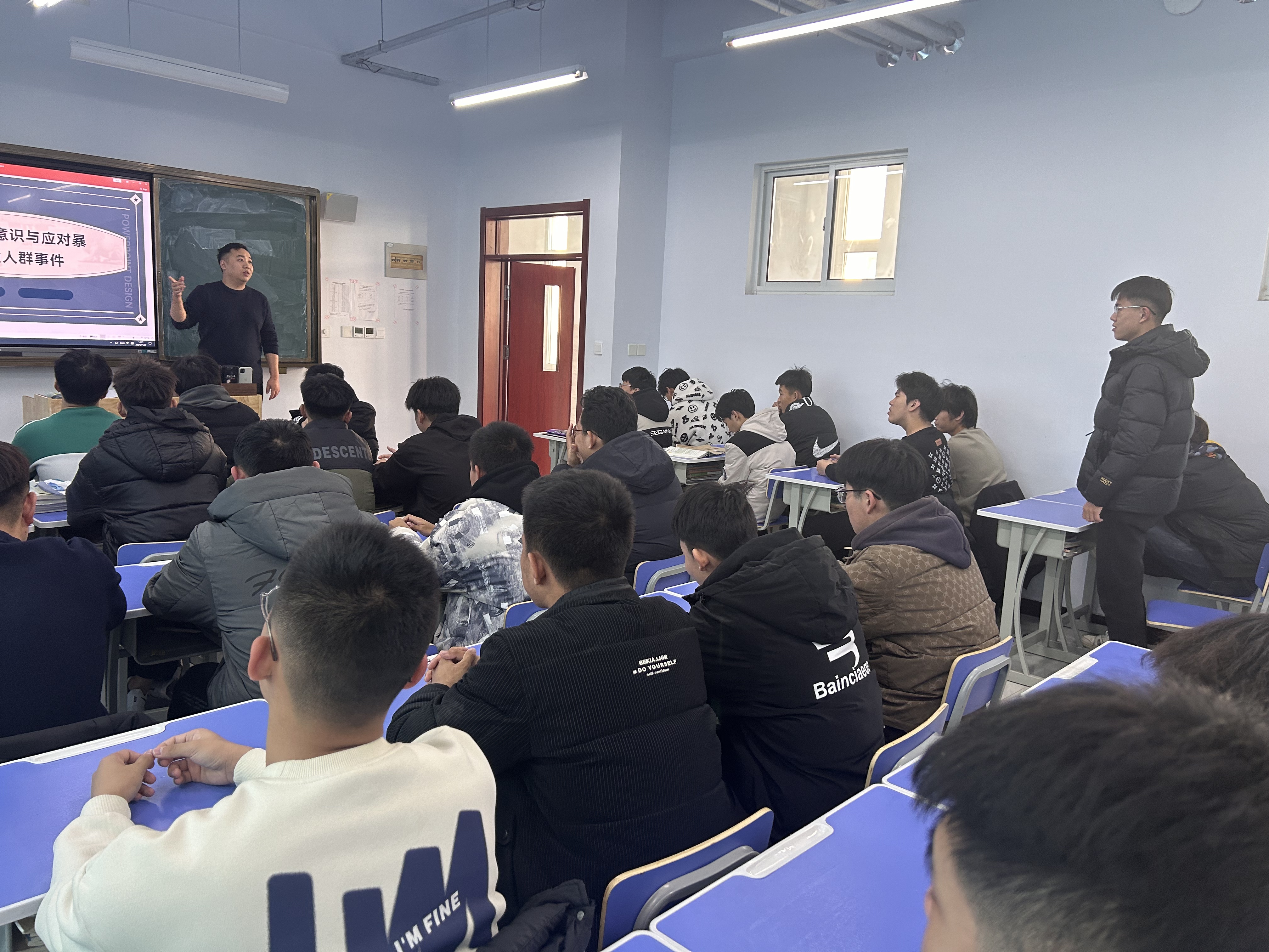 活动内容主要围绕提升个人防护意识展开。蒋成林老师通过两部分讲解:一是提升个人防护意识:详细讲解了如何识别潜在的安全隐患,以及在遇到暴徒冲撞人群等突发事件时,应如何迅速做出反应,保护自己和他人的人身安全。二是公共场所的安全防护方面,蒋老师强调了保持警觉、遵守公共秩序、不轻信陌生人等基本原则。他还特别提醒学生们在拥挤的场所要留心四周环境,避免被他人利用作为犯罪工具或受害者。