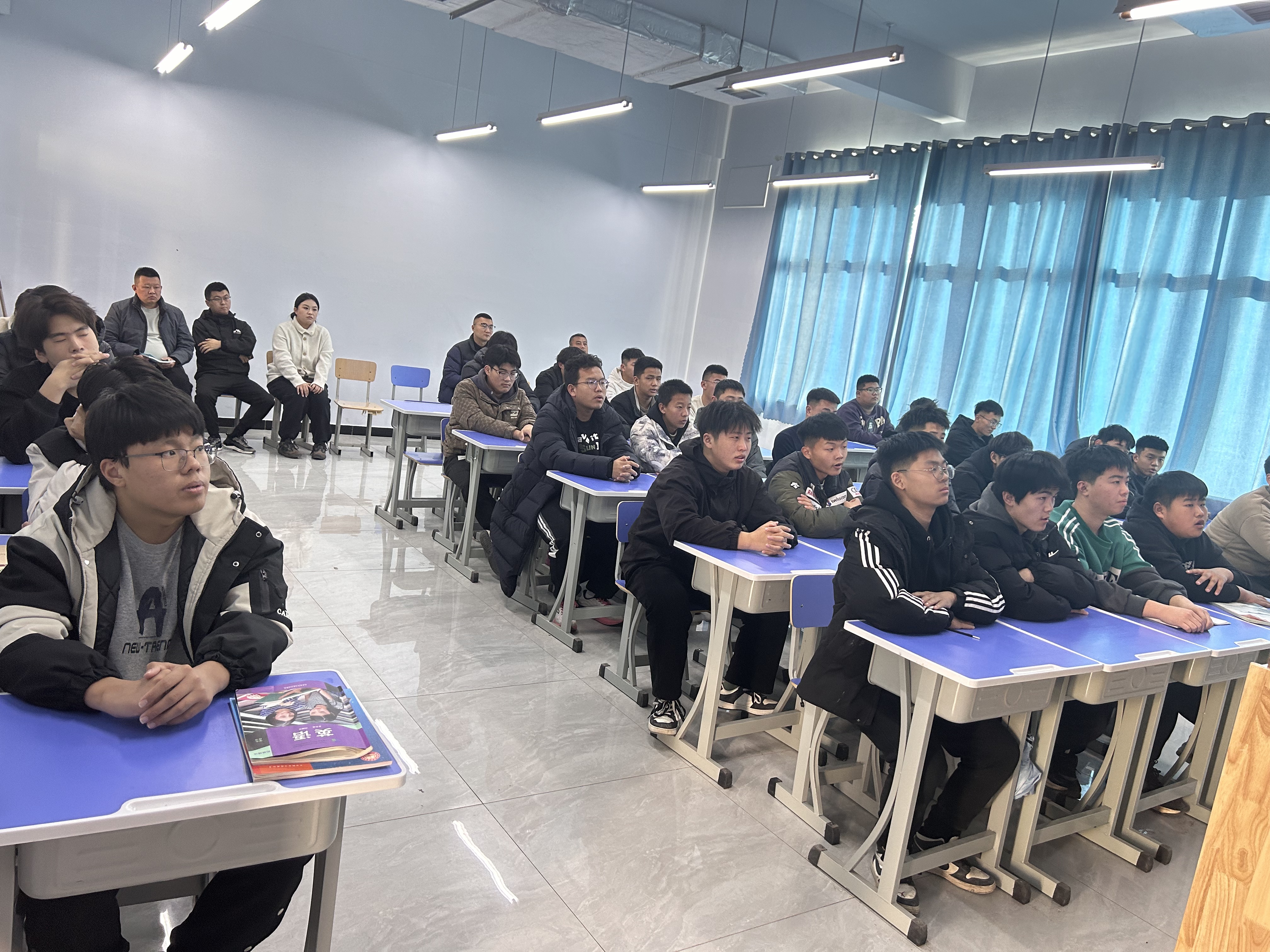 参加班会公开课的领导有刘先锋院长、周志娟副科长,学生科全体辅导员们,专职辅导员蒋成林老师担任班会主讲人。