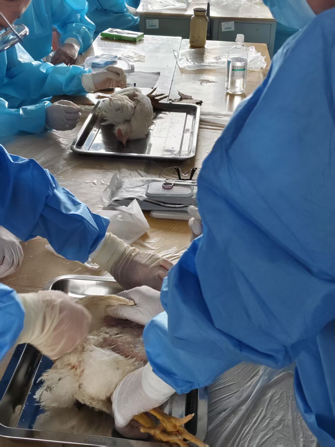 课程伊始,专业教师围绕禽类解剖要点进行理论讲解,从羽毛、皮肤结构,到肌肉分布、内脏器官位置,结合防疫检疫需求,强调解剖精准度对疫病诊断、样本采集的重要性,融入《动物防疫与检疫》等跨学科知识。实操环节,学生分组协作,严格遵循 “器械消毒 - 体表观察 - 逐层解剖 - 器官识别 - 标本处理” 流程,借助解剖工具,精准分离组织,识别心脏、肝脏等器官,将《动物解剖学》理论转化为实操能力,同时模拟防疫检疫场景,练习从解剖样本中规范采集检测素材。