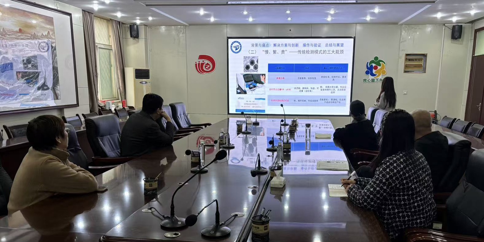 会上,姜莹莹老师以PPT结合实物演示汇报:“这款基于等温扩增技术的试剂盒,解决传统检测‘慢、繁、贵’痛点——1小时内出结果,仅需水浴锅即可操作,单份成本较进口产品降低30%-40%,通过颜色变化(阳性天蓝色、阴性蓝紫色)肉眼判读,非专业人员经15分钟培训就能上手。”同时展示了特异性、灵敏度验证数据,及学生陈诺、蒋梦迪在检疫岗位的实习实操案例。