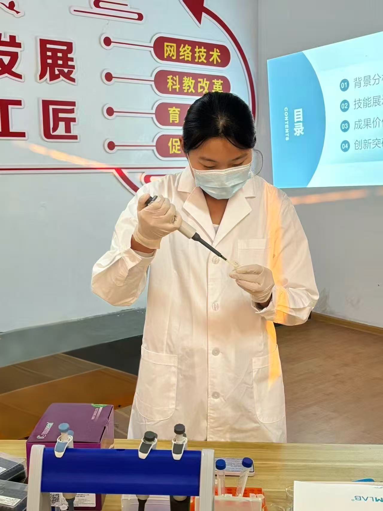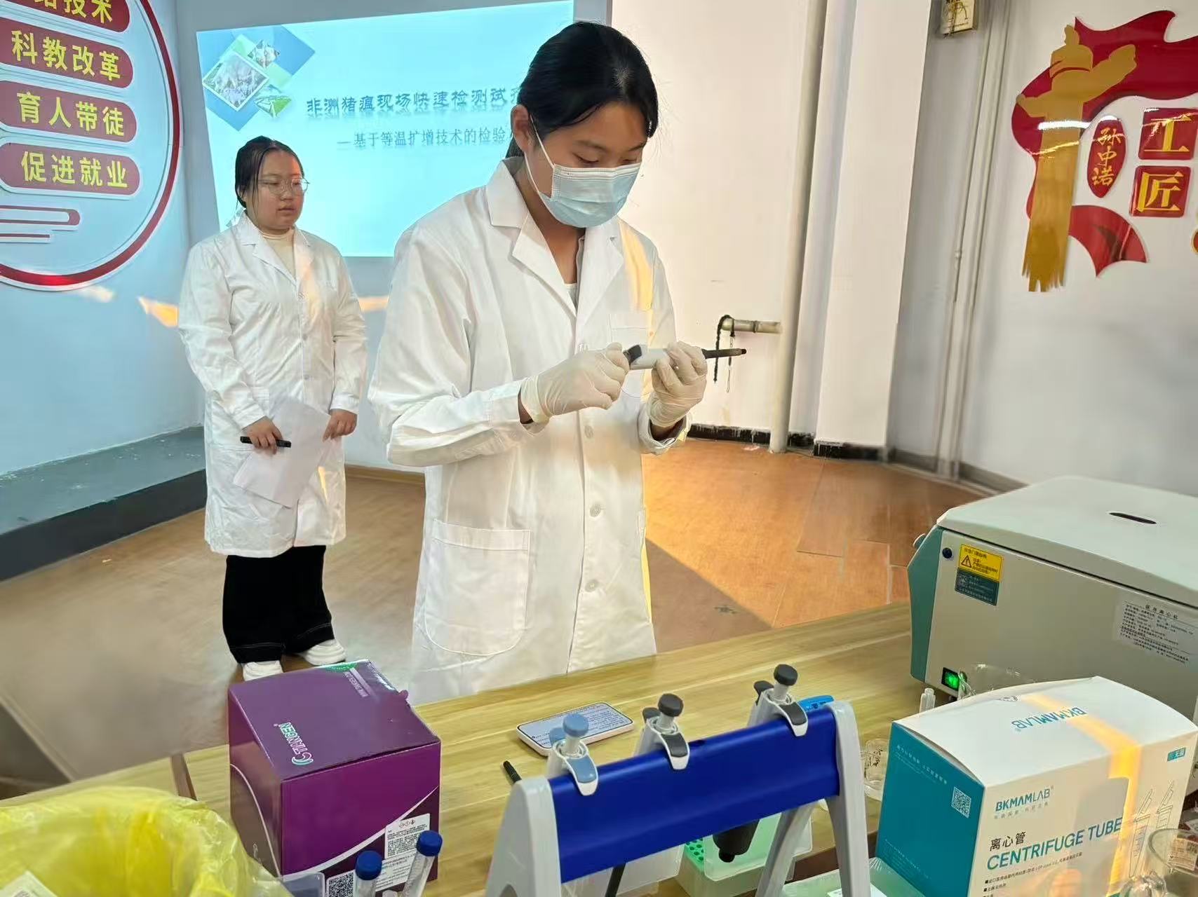 本次备赛由我院党总支邵淑华书记带队统筹,乔文静、姜盈盈两位专业老师担任指导教师,聚焦基于等温扩增技术的检疫检验项目—非洲猪瘟现场快速检验试剂盒,组织两名学生开展全流程实操训练。备赛期间,师生们紧盯样本处理、加样操作、结果判读等关键环节反复打磨,同时精修项目PPT内容、优化比赛操作流程展示细节。师生同心协力、刻苦钻研,以严谨的态度和扎实的专业功底,全力为赛事做好充分准备。