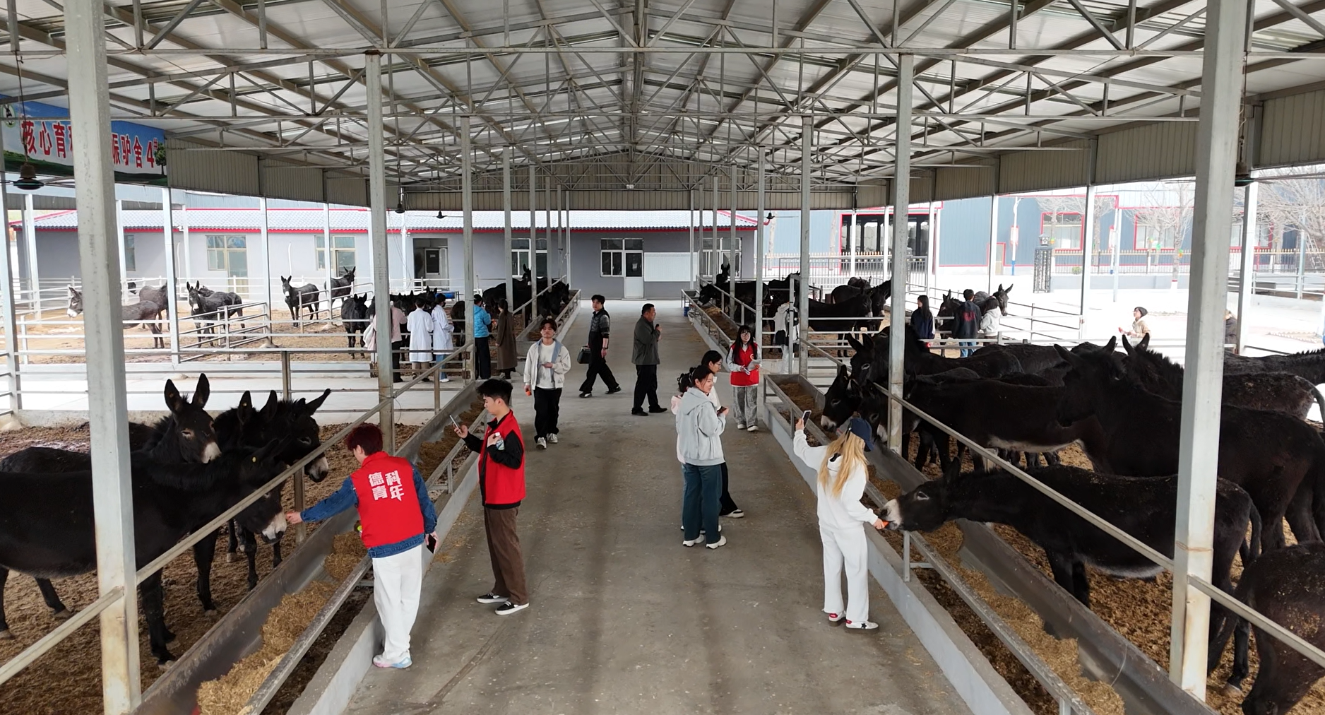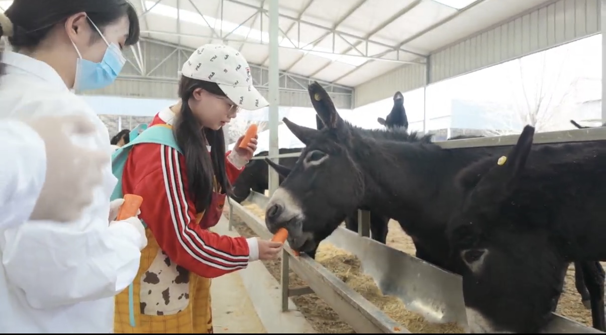 随后,师生们来到德州驴养殖场,开启养殖观摩与趣味互动环节。大家实地观摩种公驴、繁殖母驴、幼驹等不同生长阶段驴群的饲养管理、圈舍环境与饲喂流程,在技术人员指导下分组进行胡萝卜投喂互动,近距离观察驴的采食习性与性情。现场还开展了驴年龄鉴别教学,技术人员通过牙齿鉴定法演示讲解鉴别要点,学生们分组观察学习,将理论知识与现场认知结合起来。