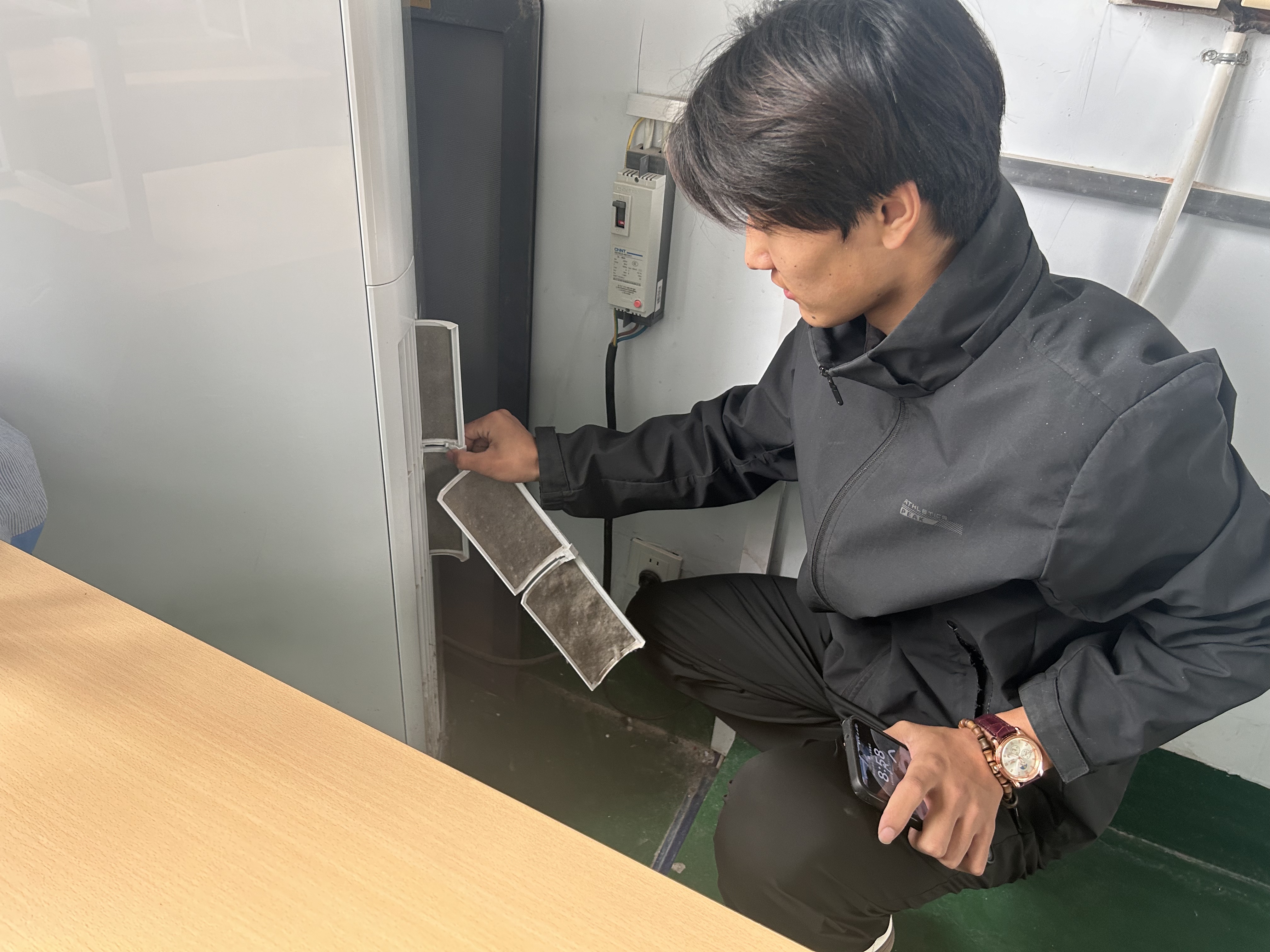 活动中,老师们带头示范,耐心指导学生干部拆卸空调面板、取出积尘的滤网,并用清水冲洗、消毒晾干。学生干部们分工协作,有的仔细擦拭滤网上的灰尘,有的记录设备状态,还有的主动清理教室角落杂物。“滤网里的灰尘比想象中多,清洗后空调出风都更清爽了!”学生一边擦拭滤网一边感叹。据悉,此次行动覆盖我院教室,不仅改善了室内空气质量,更让学生在劳动中增强了责任意识。