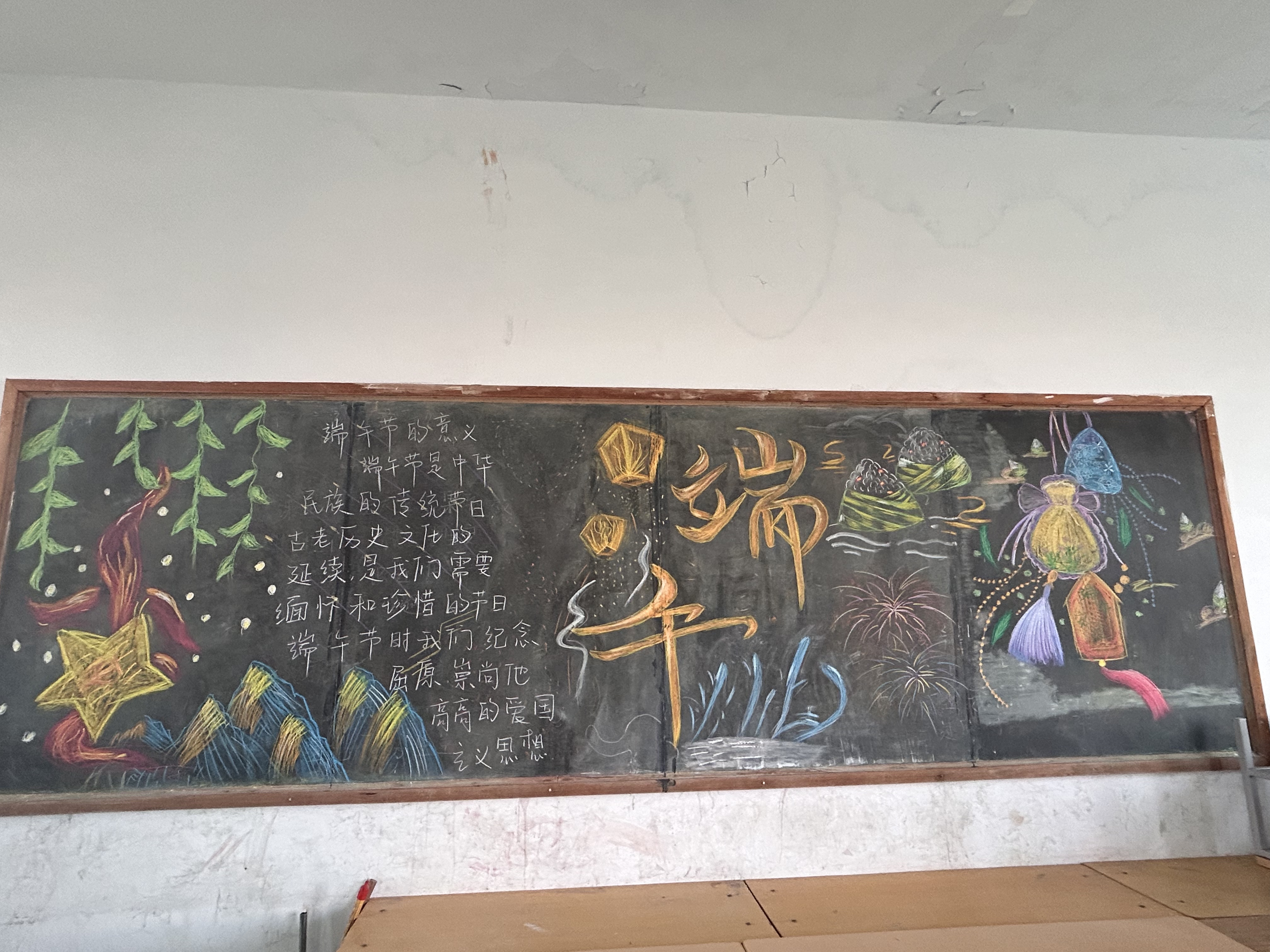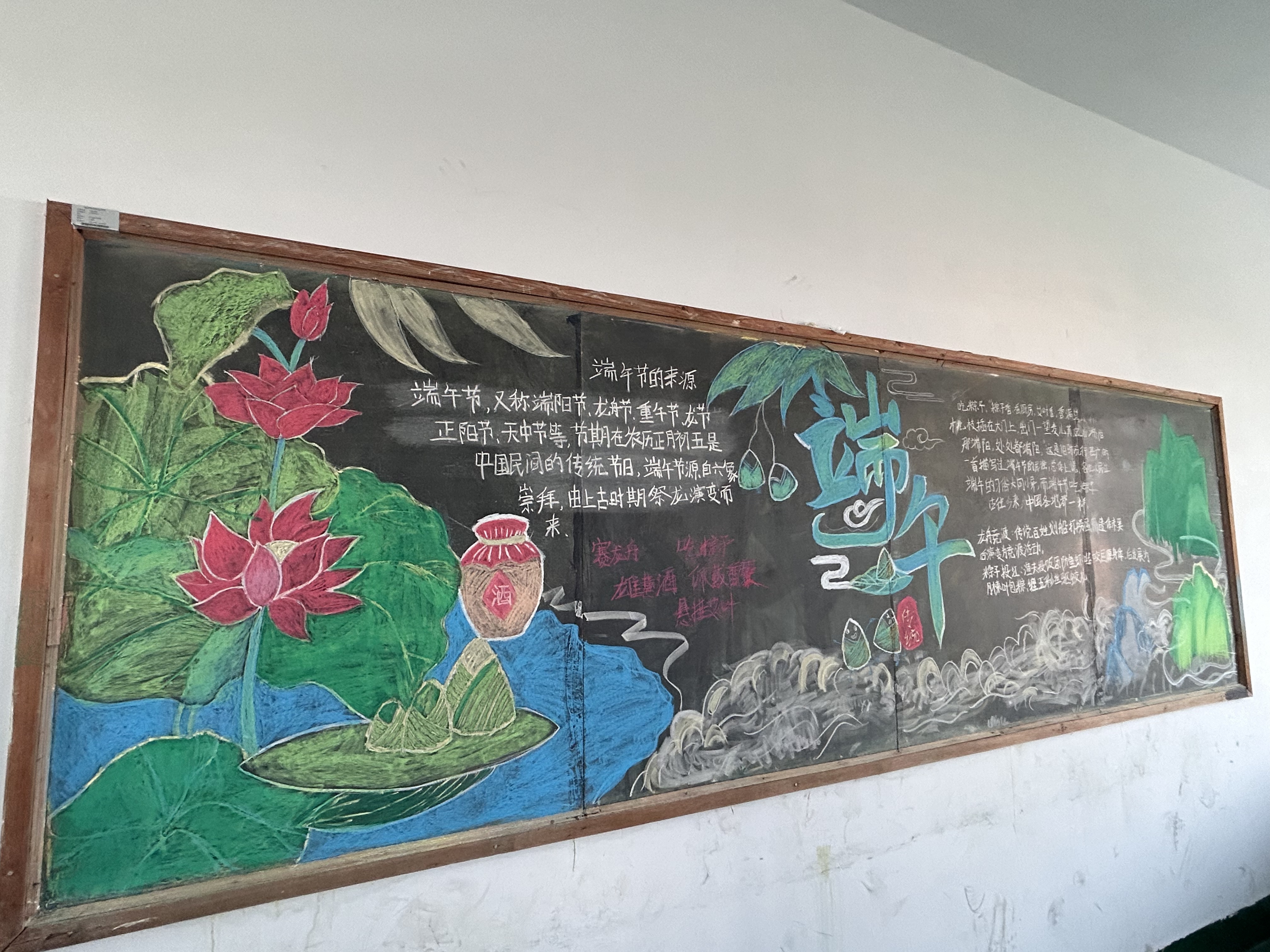 乡村振兴学院(五年制大专部)开展端午节黑板报创作活动,以“诗画交融,传承文化根脉”为主题,师生共同绘就端午文化长卷。黑板报左侧书“乙酉端午”诗句,借风雨、汨罗江缅怀屈原忠魂,右侧以金色龙舟、粉色荷花呼应——龙舟象征竞渡习俗,荷花暗合屈原高洁品格,传统诗词与粽子、艾草等民俗符号相映成趣,既展现“祭屈原、祈安康”的文化内涵,又以斑斓色彩传递节日氛围。