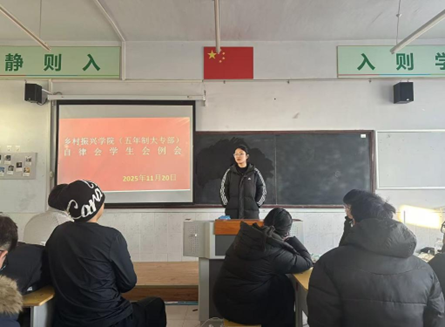 11月20日下午16:00,乡村振兴学院(五年制大专部)自律会、学生会全体成员在4-601教室召开思想例会,会议由负责人王鑫雨老师主持,聚焦工作作风建设与职责落实,筑牢学生骨干服务意识。