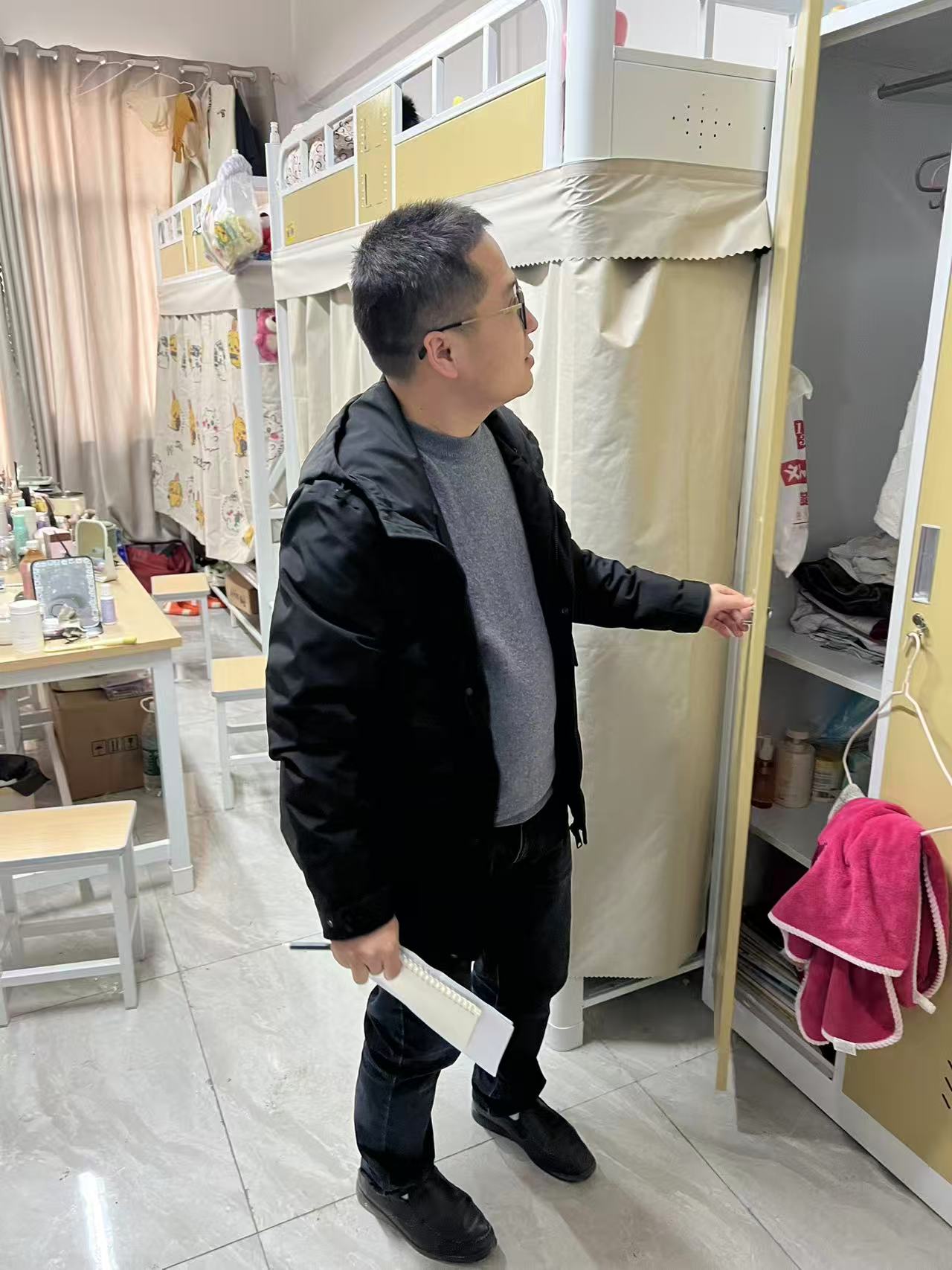 检查中,团总支副书记兼学生科副科长王泽坤与专职辅导员们深入我院学生各宿舍,对室内用电情况进行全面细致排查,重点核查是否存在使用电煮锅、电热棒、大功率取暖器等违规电器,以及私拉乱接电线、插座违规摆放等安全隐患,对发现的问题现场记录、及时整改。