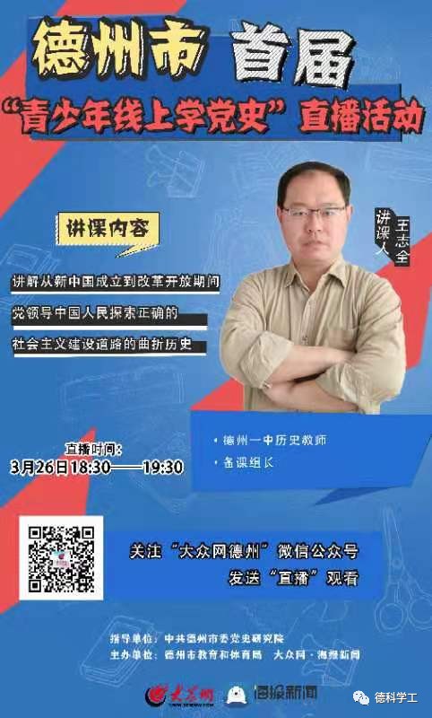 为了使同学们更加了解党史重温经典事件,德州首届关于青少年的线上党史开课了,本次线上讲座邀请了来自德州一中的备课组长、历史教师王志金老师。德州市 首届 “青少年线上学党史”直播活动。