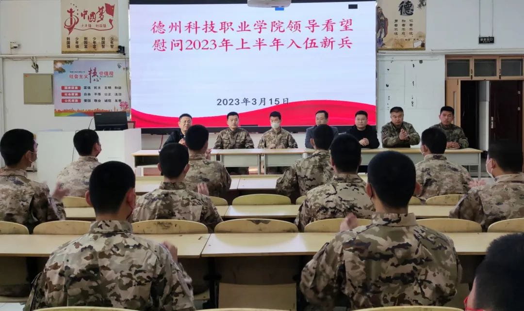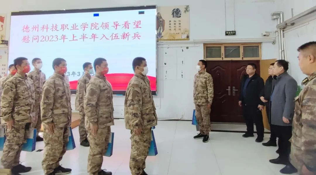 3月15日下午,学院党委委员、副院长李进民一行三人前往禹城市新兵役前训练基地,看望慰问从我院应征报名正在参加役前教育的16名新兵。学院党委委员、党政办主任、团委书记孙强强,学工处副处长、武装部副部长刘艺博参加活动。