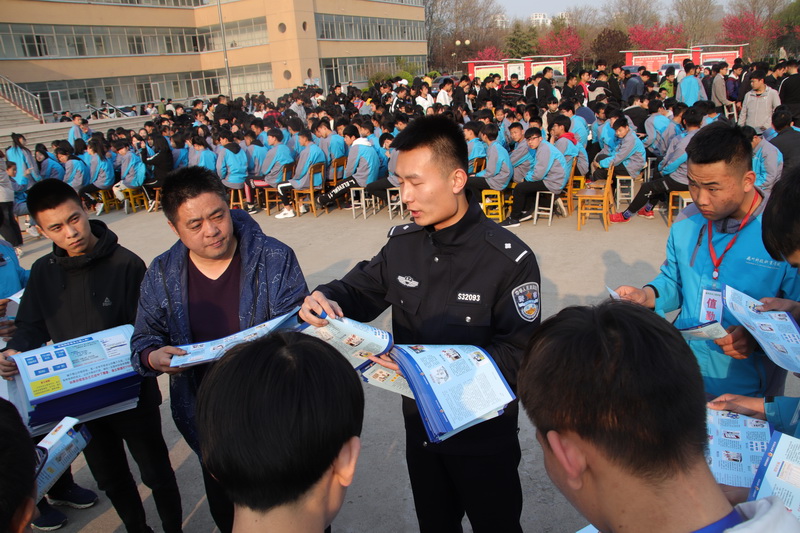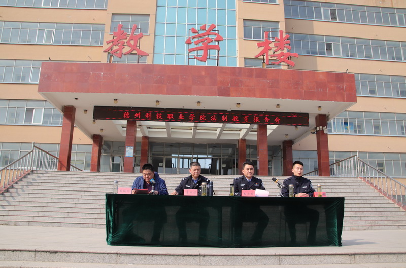 2019年4月3日在德州科技职业学院主校区文化广场举行第四个“全民国家安全教育活动日”主题活动一一“千万学生同上一堂国家安全教育课”暨“维护国家安全,建设平安校园”系列安全教育活动之法制报告会,禹城市公安局法制科科长李光明,禹城市公安局禁毒大队大队长王治国,禹城市公安局刑警大队反电信诈骗中队常庆安警官共同为我校师生普及法制、禁毒、发诈骗知识。学生处郑联先处长主持报告会。
