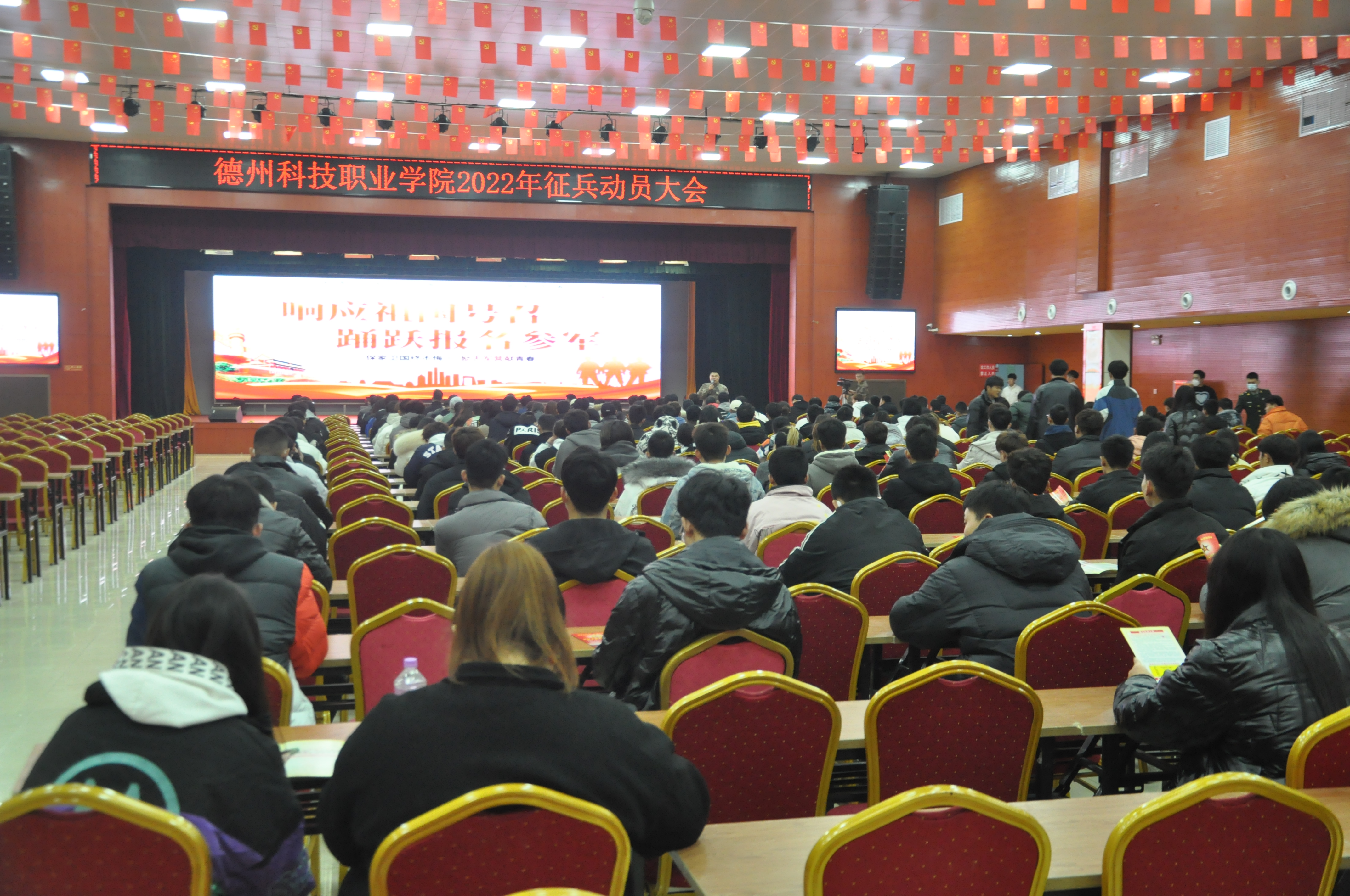 为认真贯彻落实教育部、中央军委国防动员部关于做好高校征兵工作的部署要求,充分发挥高校征兵主阵地作用,扎实做好我校2022年度大学生征兵工作,鼓励更多优秀的适龄大学生报名参军入伍,切实提高大学生应征入伍的积极性和参与度,2021年12月15日下午,我校联合禹城市人武部在大禹大礼堂举行禹城市2022年征兵宣传进校园活动启动仪式暨德州科技职业学院2022年征兵动员大会。禹城市人民武装部政工科满东主任、军事科刘士超参谋、学工处副处长刘艺博,退役复学大学生代表、有意向应征入伍的在校大学生一起参加活动。