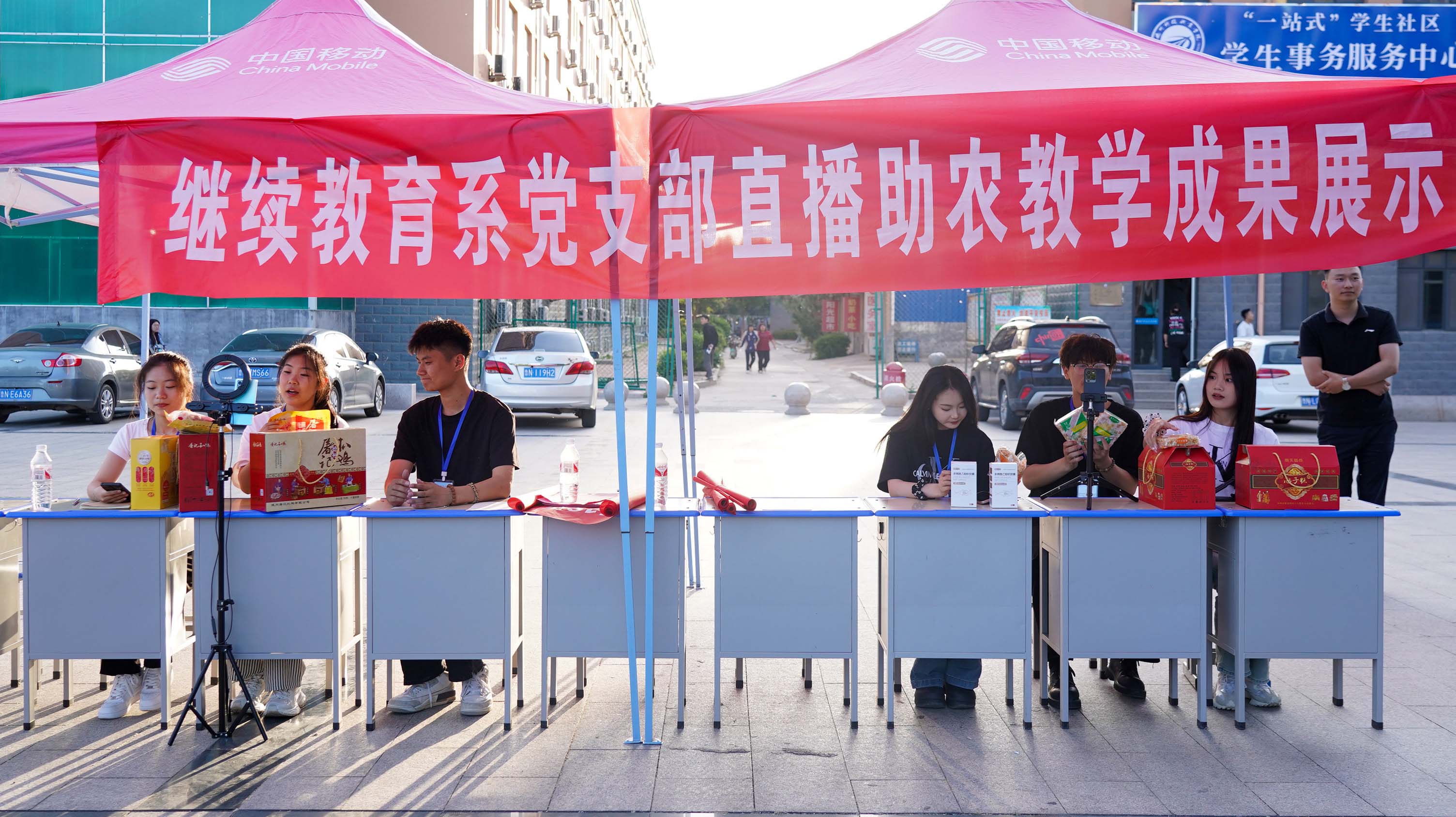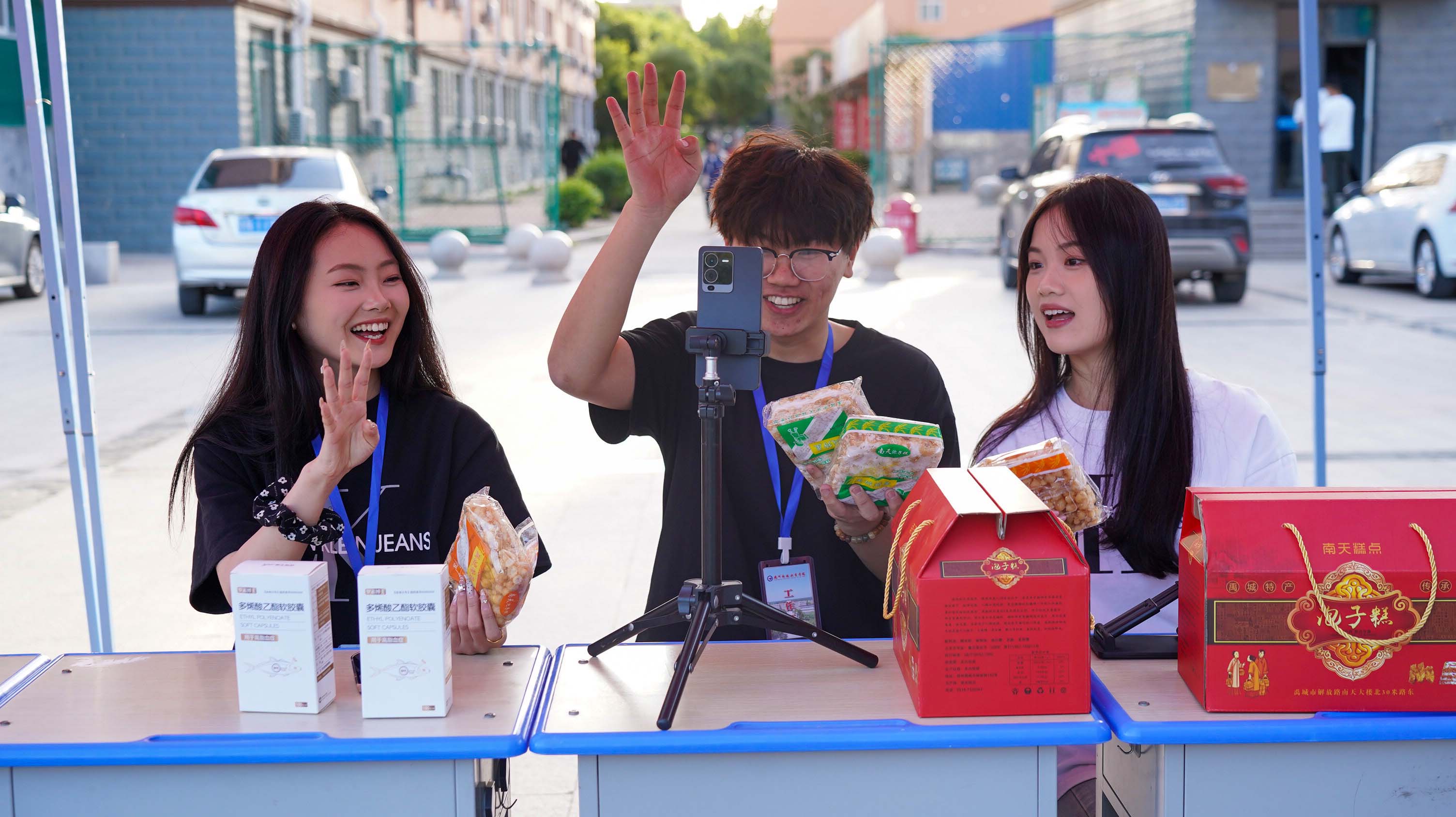 直播助农成果展示,学生在介绍扒鸡、木糖醇等禹城特色商品。
