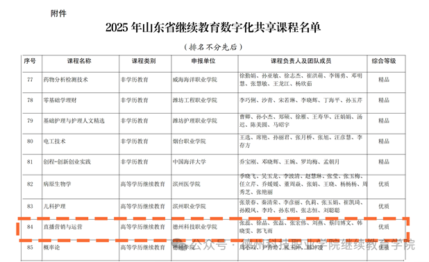 12月31日,山东省教育厅正式发布了《关于公布2025年度继续教育数字化共享课程遴选结果的通知》,经我校积极推荐申报、专家评审、综合评议及公示等严格程序,我校精心申报的《直播营销与运营》与《职业发展规划与实战赋能》两门课程脱颖而出,成功入选省级继续教育数字化共享课程库。这标志着我校在继续教育数字化转型与优质课程资源建设方面取得了又一重大突破。