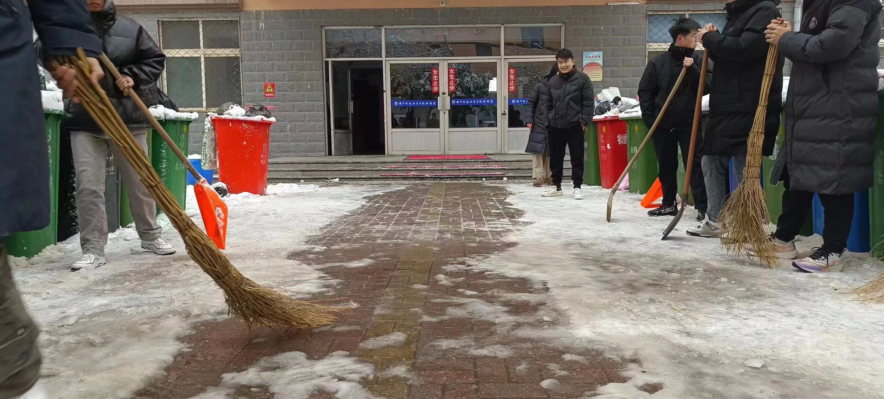 为确保同学们出行安全,智能工程学院学生会干部及成员在刘主任和梁科长的带领下,积极开展了清理宿舍楼门口通往食堂路面的冰雪工作。