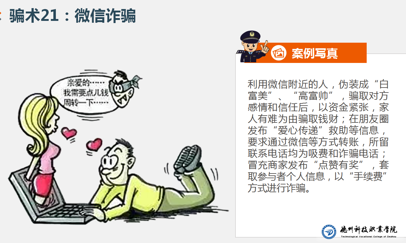 2018年8月29日,机电系组织新生们举行了一场“防电信(网络)诈骗知识”讲座,老师通过对“冒充国家相关工作人员调查唬人”、“猜猜我是谁”、“网络招工”、“破财消灾”、“淘宝刷单”等案例对典型手段和同学们进行了交流。首先让同学们认识到了诈骗的众多形式,然后和同学们一块分享了如何识别防范电信诈骗,最后又和同学们交流了上当后的补救措施。通过这次讲座同学们对电信诈骗有了进一步的认识,在最后环节防范电信网络诈骗知识竞答环节同学们都正确的给出了答案。电信诈骗近来来更为猖獗,网络贷款渗透严重,希望通过这次讲座让同学们提高自我防范意识,免于上当受骗。