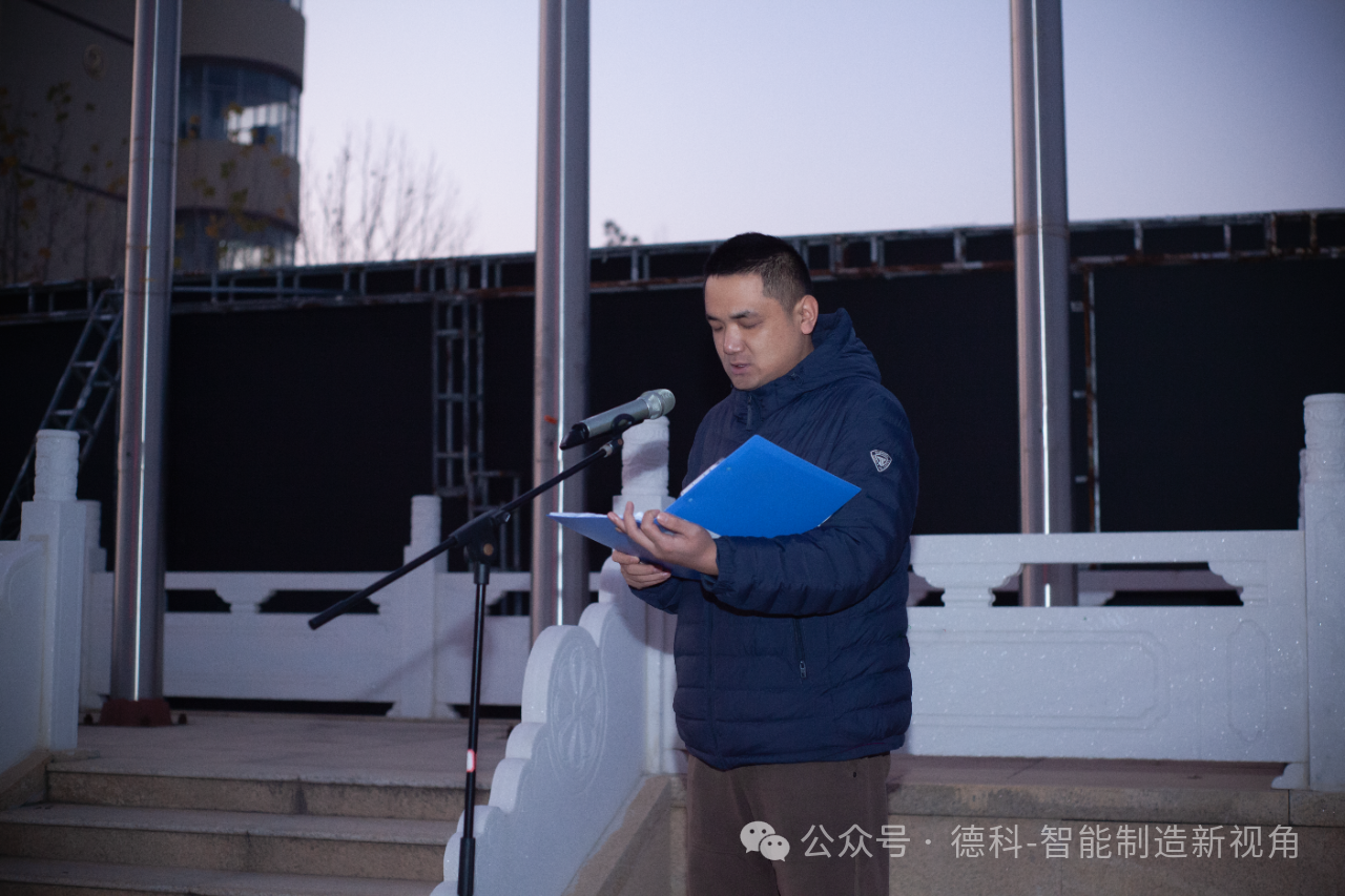 国旗护卫队出旗环节,学院国旗护卫队队员们迈着铿锵有力的步伐,护卫着鲜艳的五星红旗走向升旗台。全体师生肃立行注目礼,目光紧随国旗,满含崇敬与自豪。“升国旗,奏唱国歌!” 当雄壮的《义勇军进行曲》响彻校园,升国旗,奏唱国歌仪式正式开始。全体师生齐声高唱国歌,深情凝望五星红旗在晨光中冉冉升起、迎风飘扬。这一刻,爱国情怀在每个人心中激荡,身为新时代智能制造学子的责任感与使命感也随之升腾。