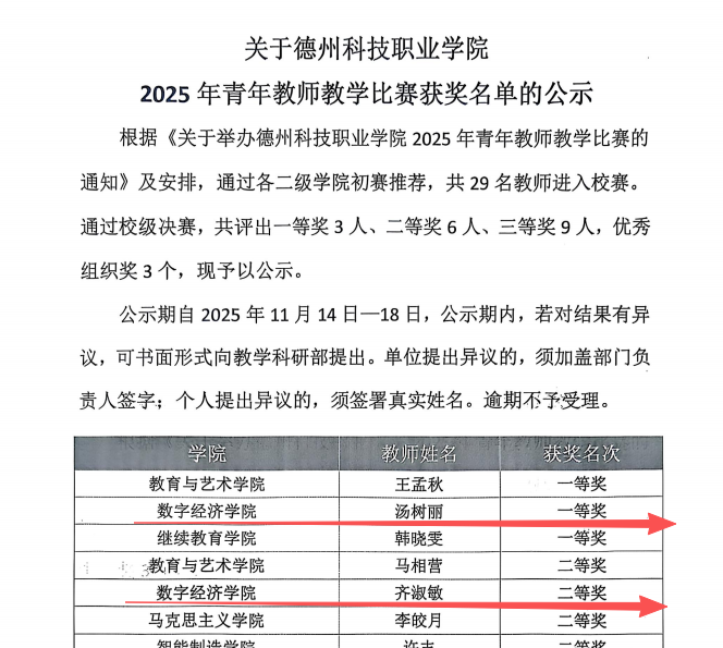 近日,德州科技职业学院2025年青年教师教学比赛结果正式揭晓,数字经济学院汤树丽、齐淑敏两位教师凭借出色的教学表现,在全校29名参赛教师中脱颖而出,分别荣获一等奖和二等奖的优异成绩,充分展现了我院青年教师扎实的教学功底和卓越的专业素养。