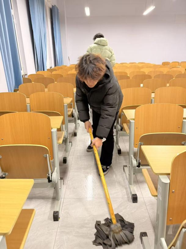 清扫过程中,师生们分工协作、默契配合,展现出饱满的热情与务实的态度。大家手持清扫工具,对教室进行全方位清理:擦拭多媒体屏幕、投影仪等设备时轻拿轻放,细致去除灰尘;清扫地面时采用“先扫后拖”的方式,不放过任何卫生死角;整理课桌椅时将其摆放整齐,擦拭桌面污渍并清理杂物。针对教室角落、窗台缝隙等难以清洁的部位,大家齐心协力逐一攻克,充分彰显了团结协作的精神风貌。
