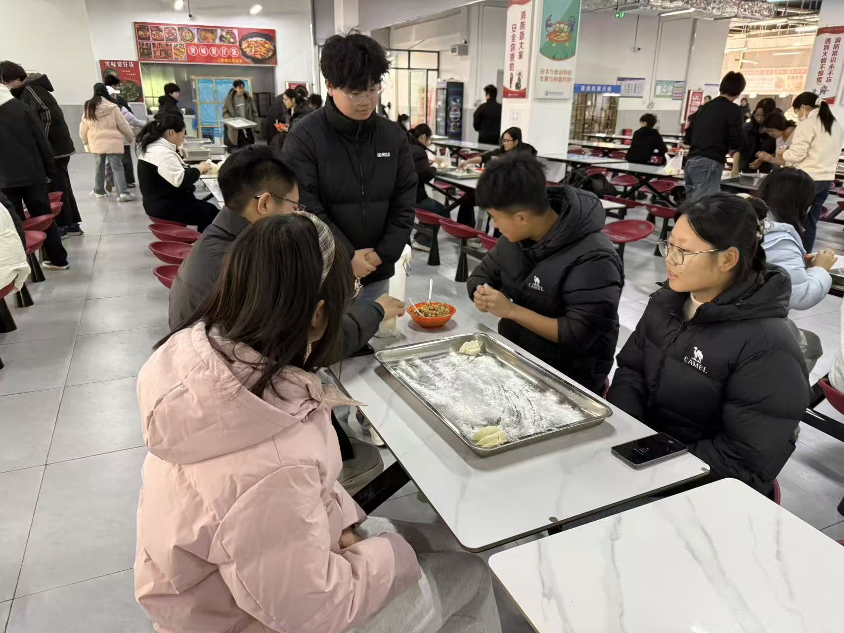 活动现场暖意融融,同学们齐齐上阵,分工协作。揉面、擀皮、包饺子,大家各显身手。有的同学手法娴熟,捏出的饺子圆润饱满、造型精致;案板上,一个个白白胖胖的饺子错落排列,现场欢声笑语不断,洋溢着浓浓的“家”的味道。