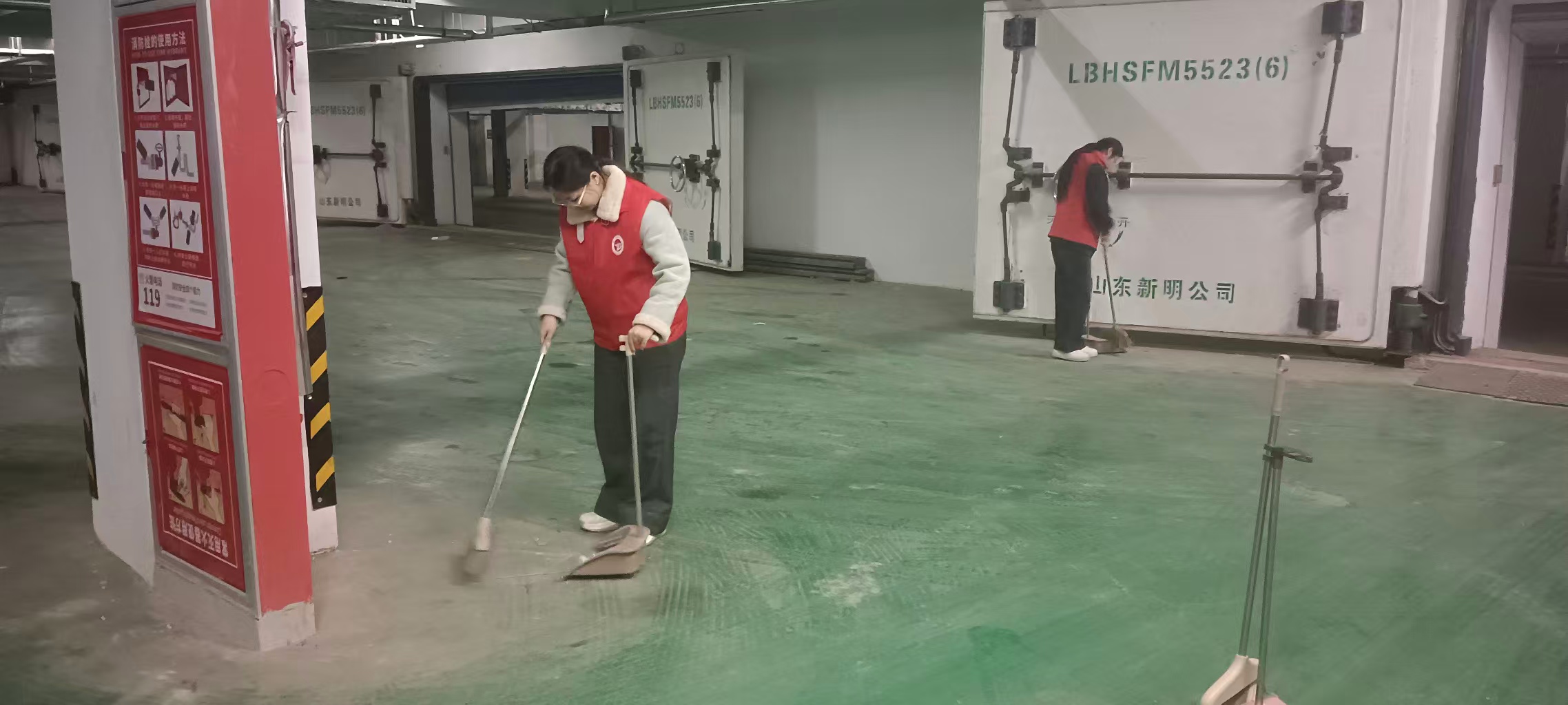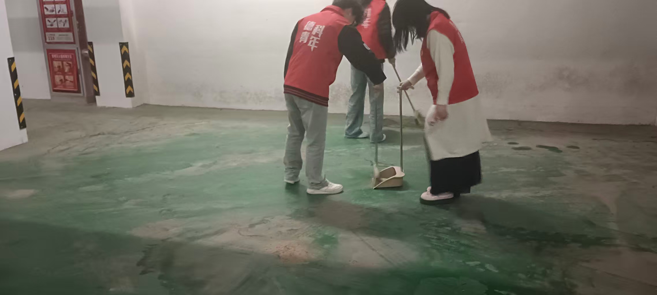 活动当天,志愿者们在指定地点集合签到,领取反光背心和清洁物资后,分组前往对应地库开展作业。B8地库组重点清理主干道灰尘、墙角蛛网和废弃杂物,用除胶剂处理地面污渍与墙面张贴物;实训楼地库组则针对实训区域周边杂物、地面灰尘进行清理,同步擦拭地库扶手与标识牌。大家分工协作,不怕脏累,严格按照安全规范操作工具,高效推进清洁工作,让地库环境焕然一新。