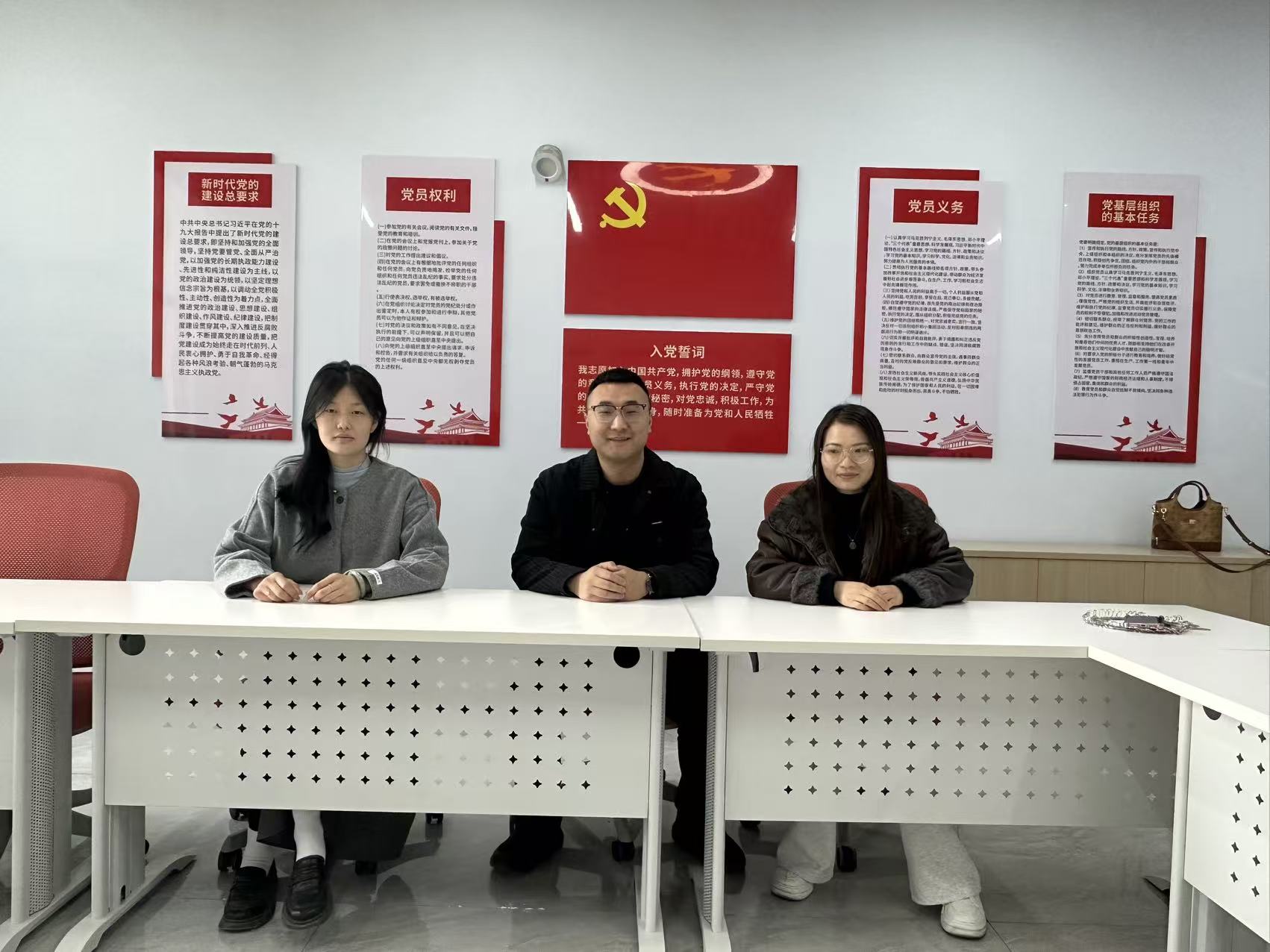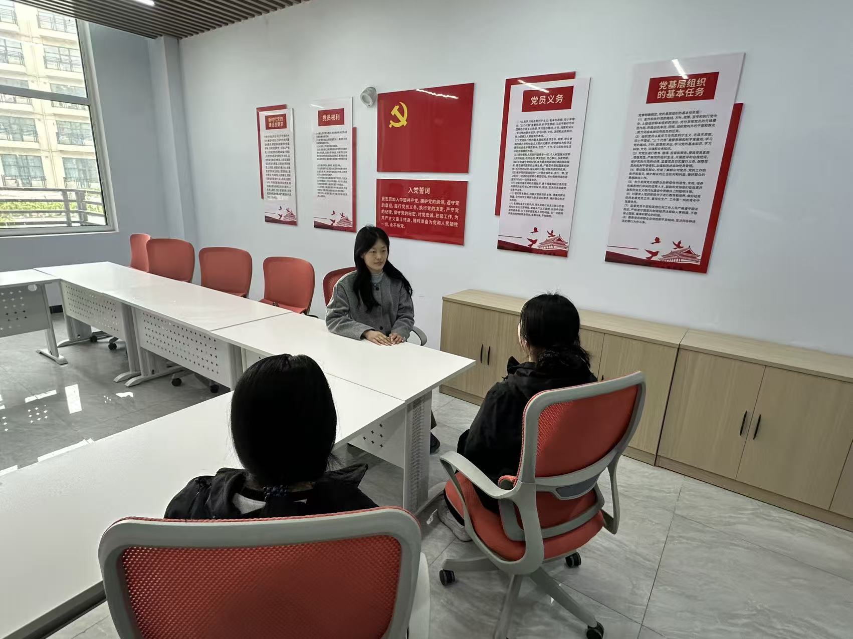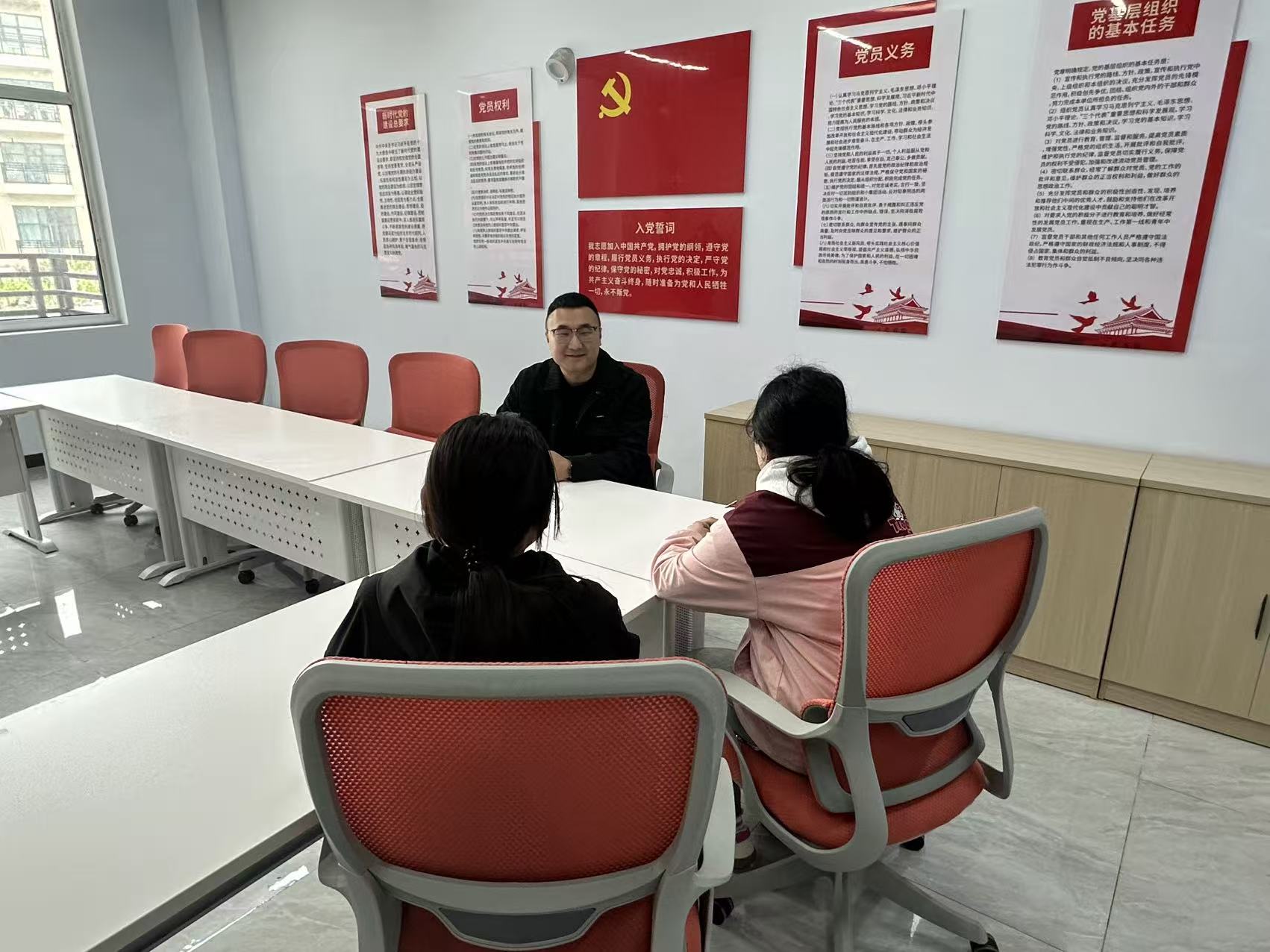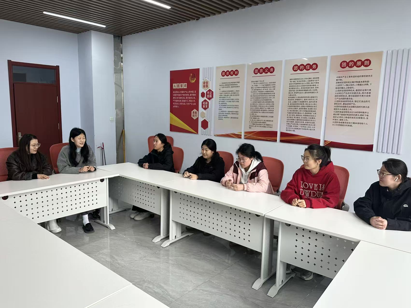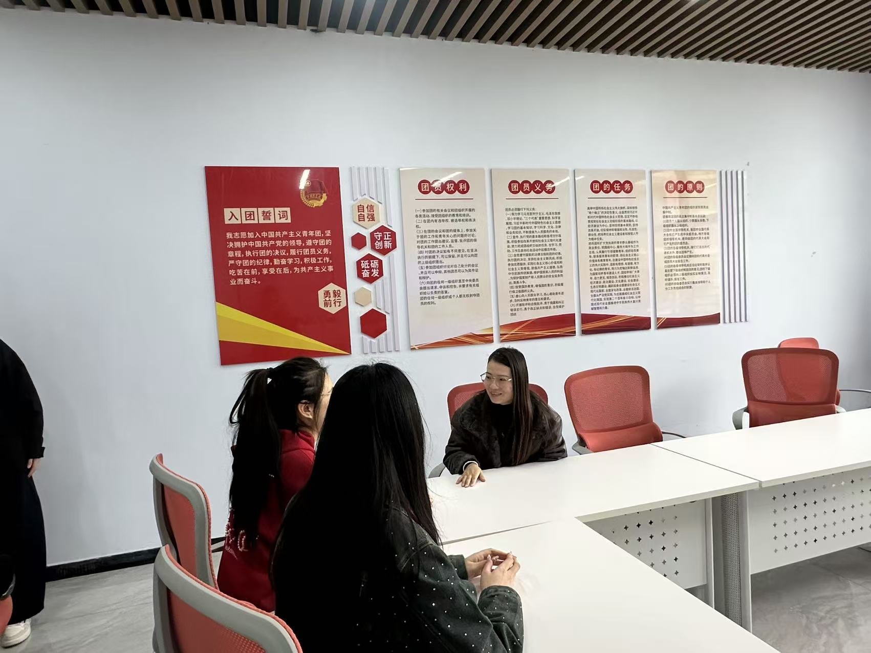 一站式党团活动室墙面张贴着入党誓词、党员权利义务、团的章程等宣传内容,庄重而温馨的红色氛围,为师生谈心谈话营造了严肃又亲切的环境。在这里,辅导员们褪去工作中的严肃拘谨,以朋友、引路人的身份,与同学们围坐在一起,敞开心扉、倾心交流。