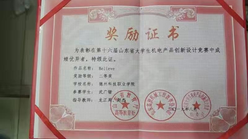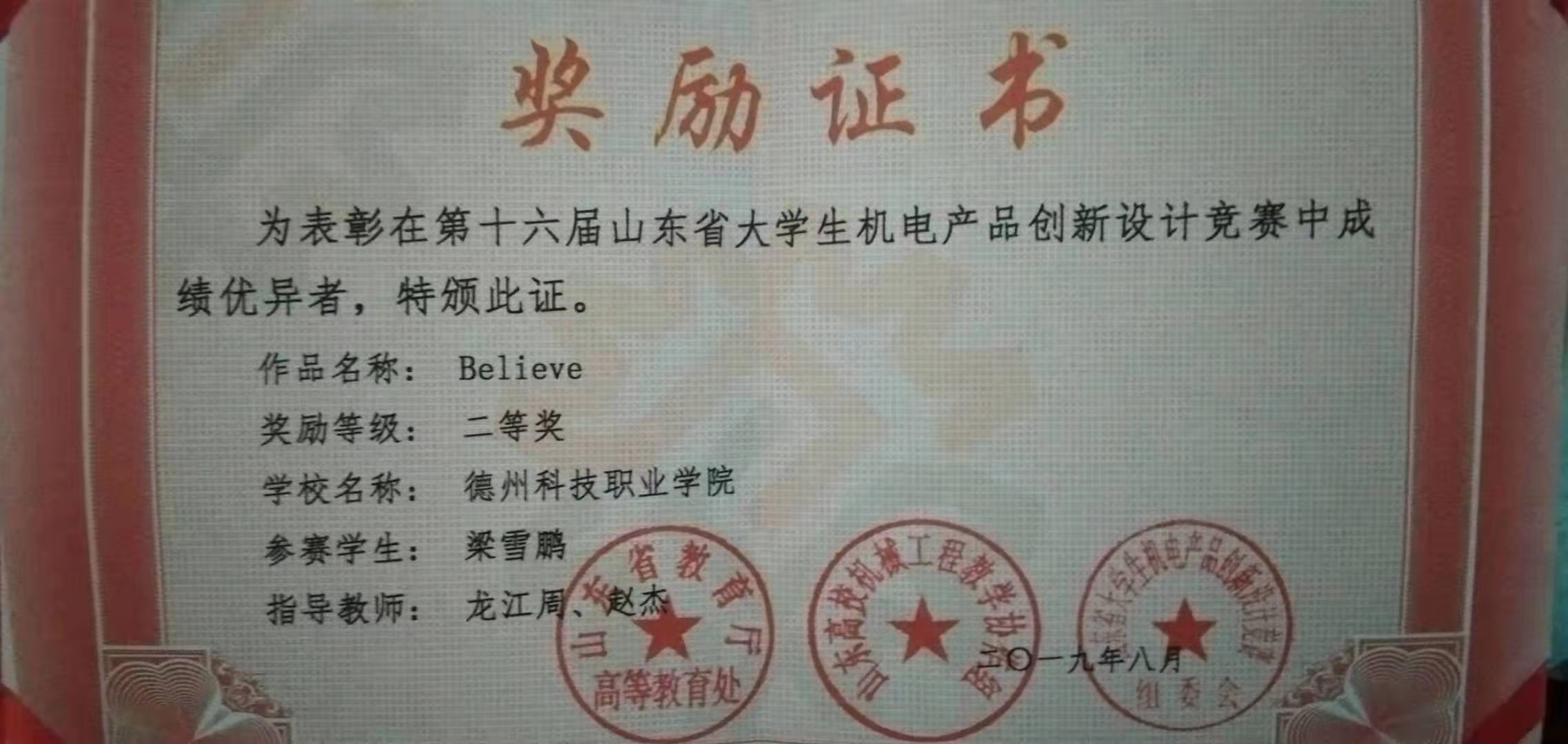 经过一天的比赛,由董勇老师和石坤老师带领的崔亚巍、马云飞、李俊、武广锴、王楠玉五名同学的作品墙壁绘图机器人获得省级三等奖;由龙江周老师、赵杰老师带领的梁雪鹏、许凯伦、杨増鸿、武广锴四名同学的SolidWorks软件比赛获得省级二等奖的好成绩。