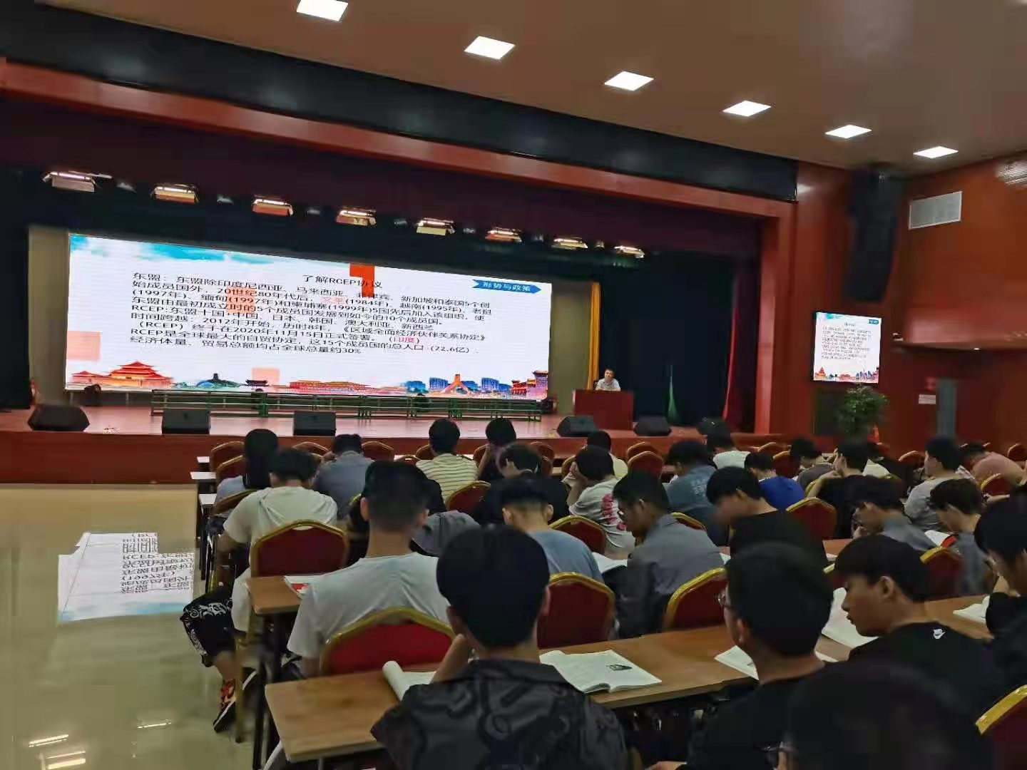 为了加强同学们对形式与政策相关内容的学习和理解,让广大青年学生深刻认识当前我国的发展形式和当代大学生应当肩负的历史责任,于2021年5月26日,智能与航空学院全体学生前往大礼堂听张祖军院长讲授的“区域全面经济伙伴关系协定”专题讲座。全体学生按时有序前往大礼堂听讲。
