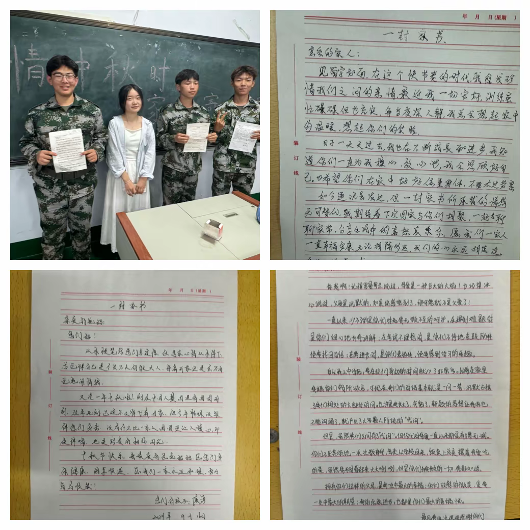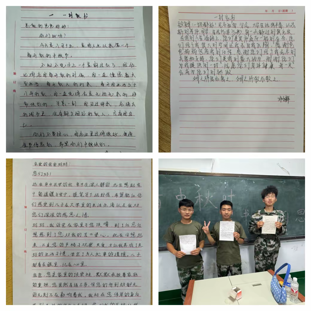 在这意义非凡的活动中,交通学院的学子们尽情地挥毫泼墨,以最传统且充满温馨的书信方式,将他们对中秋佳节的深刻感悟、对父母的深沉爱意与无尽的感激,化为感人肺腑的文字,流淌于纸端。每一行真挚的文字都承载着他们对家的思念与对亲情的珍视,这份跨越时空的沟通方式,犹如一座心灵的桥梁,传递着温暖与力量,让遥远的距离变得亲近无间。