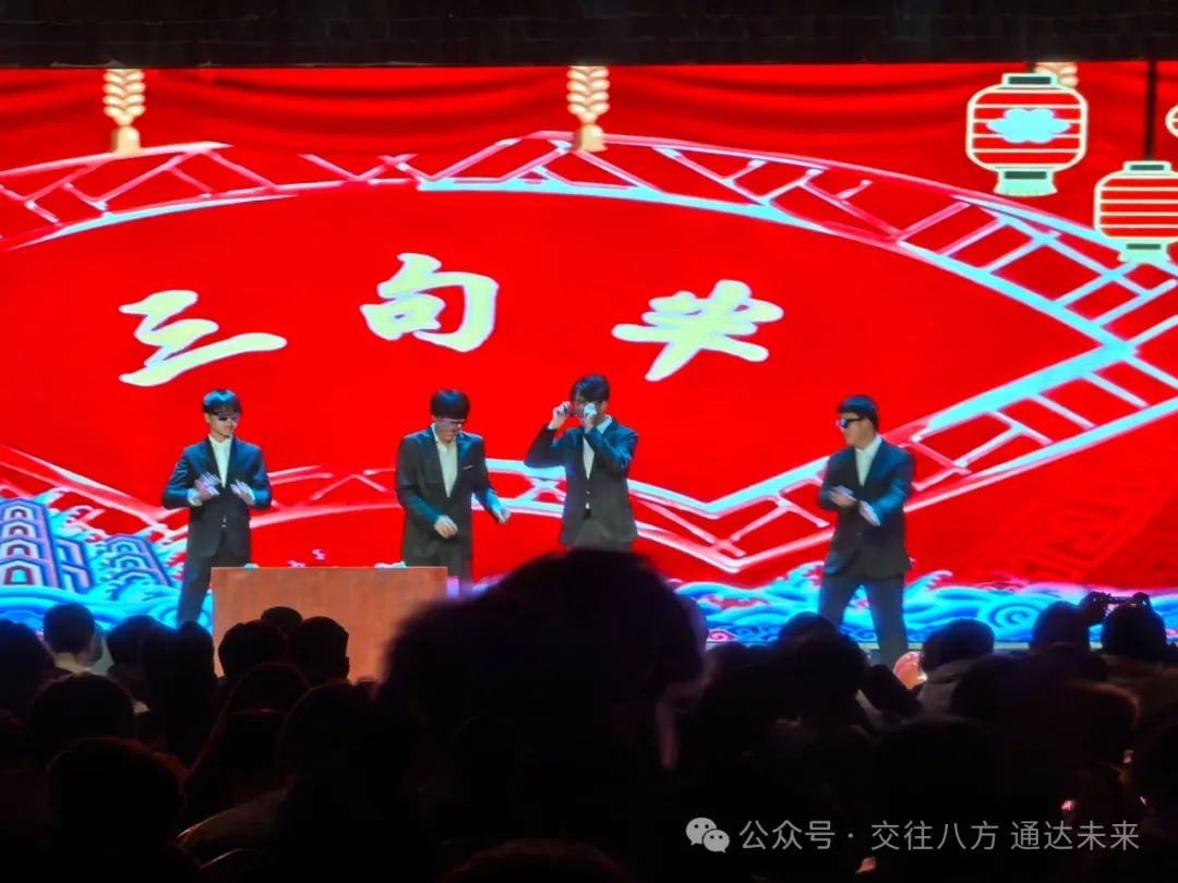 晚会开场是由学校团委带来的舞蹈表演,舞者们优雅的舞姿瞬间点燃了现场的气氛。紧接着,一首深情的独唱《成都》,悠扬的歌声让观众沉浸在对时光的感慨之中。相声《巧对对联》以幽默诙谐的方式展现了交通学院师生之间、同学之间的深厚情谊和日常生活中的趣事,引发了全场阵阵笑声和共鸣。