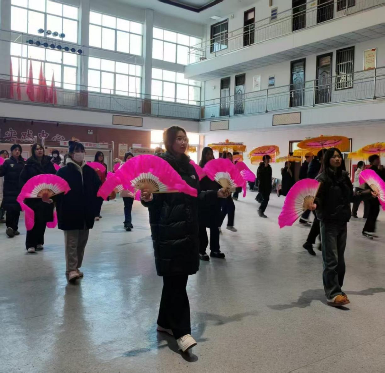 春节返乡期间,交通学院杨家铭、张宇朔踊跃投身非遗传承活动。在实践中心的大厅内,他们手执明艳的粉色折扇,身姿矫健,神情专注地研习传统舞蹈技艺。四周,还有人摆弄着精致的花伞等非遗物件,尽显传统文化韵味。他们在这浓厚的氛围中感受非遗魅力,传承之心坚定不移,为传统文化的弘扬注入蓬勃朝气。