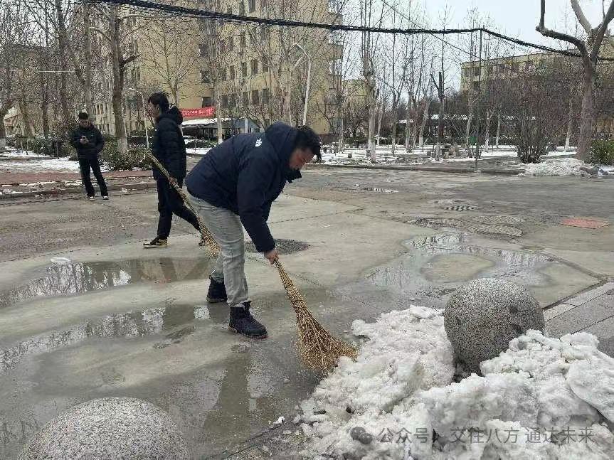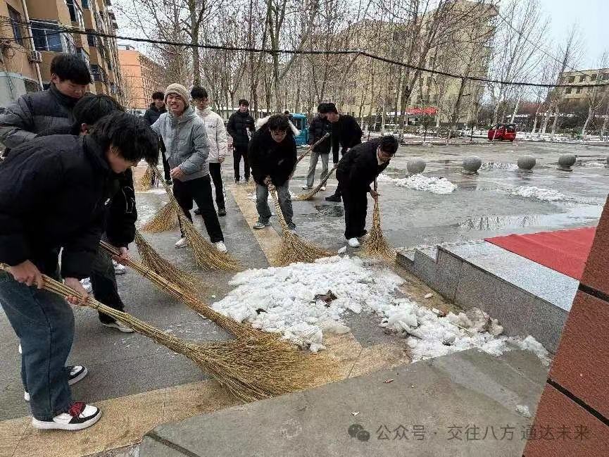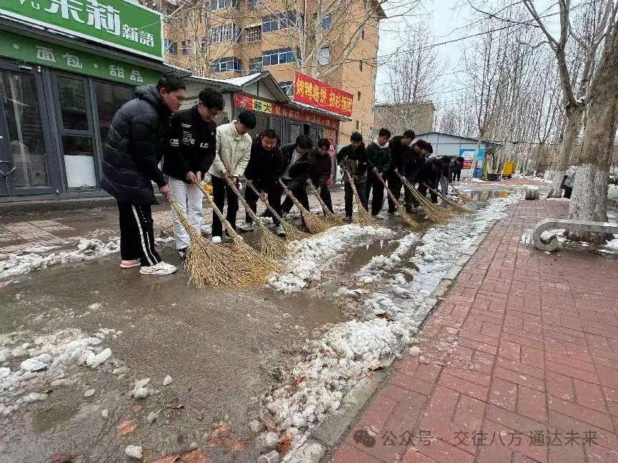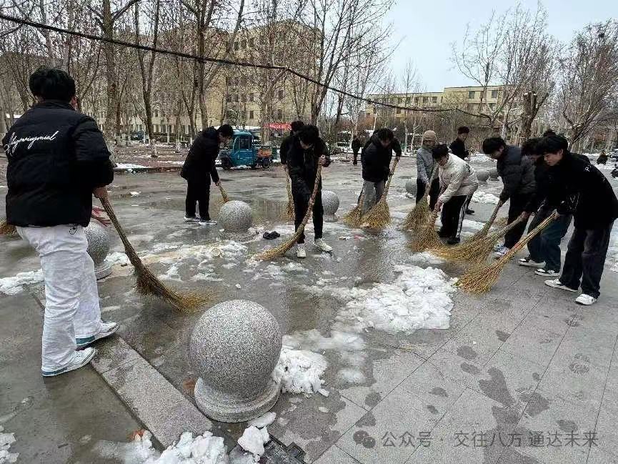 在冬日的寒风中,交通学院展现出了团结协作、勇于担当的精神风貌。近日,一场突如其来的降雪给校园带来了不便,然而,交通学院的党员教师们却展现出了先锋模范的担当,他们率先挺身而出,以积极主动的姿态组织起团总支学生会的学生们,一同投身到那热火朝天的扫雪志愿活动之中。短短时间内,便有 20 余名学生如同一群充满活力的小战士般积极响应号召,纷纷加入到这一行动之中,他们与党员教师们紧密携手、并肩作战,为校园的整洁与出行的安全贡献出了自己的一份力量。他们用那实实在在的行动,为师生们精心营造出了一个安全、便捷的出行环境。