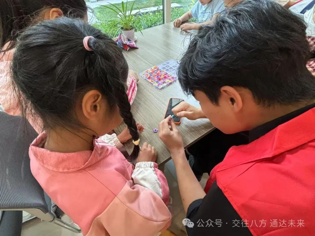 活动现场,气氛热烈而温馨。志愿者们早早做好准备,分工明确,各司其职。五彩斑斓的串珠材料整齐摆放,等待着孩子们发挥创意。志愿者们耐心细致地为孩子们讲解串珠技巧,从如何穿线到如何塑造各种造型,一步一步,手把手地指导孩子们完成每一个步骤。