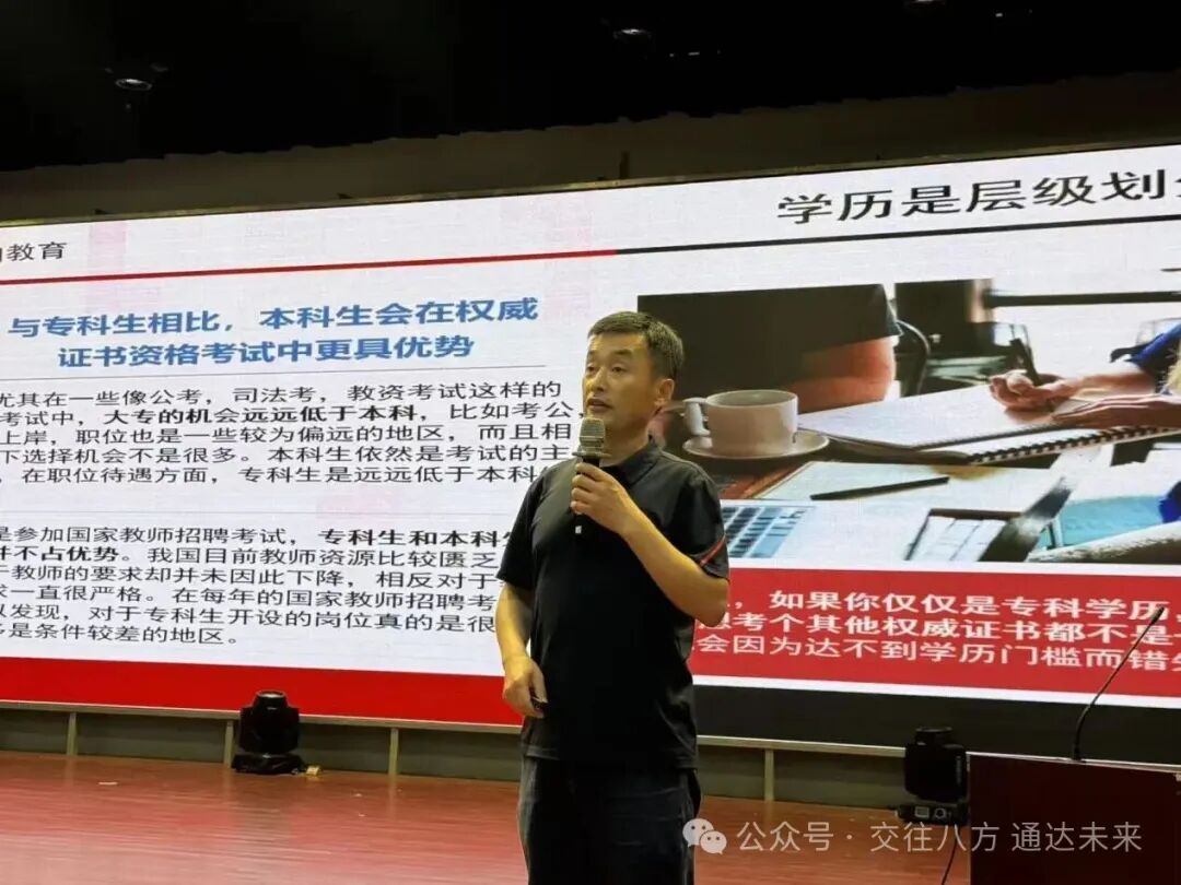 在成长交流环节,刘书记特别谈到学历在人才选拔中的关键作用。他指出,本科教育不仅是知识的延伸,更是视野与平台的跃升。选择专升本,是对自我发展的负责,也是打开更广阔人生大门的重要一步。为此,他详细介绍了“云伯专升本”的六大办学特色:通过心理测试实现个性化成长规划;精准匹配教学策略,因材施教;依托高升学率树立信心;以榜样力量激发内驱力;全程陪伴式辅导,助力稳步提升;强调自律与坚持,成就可持续成长。