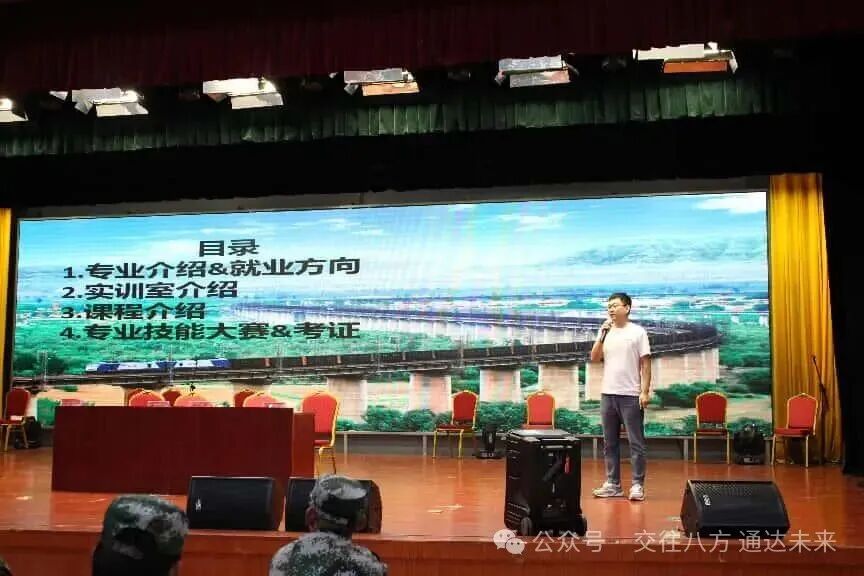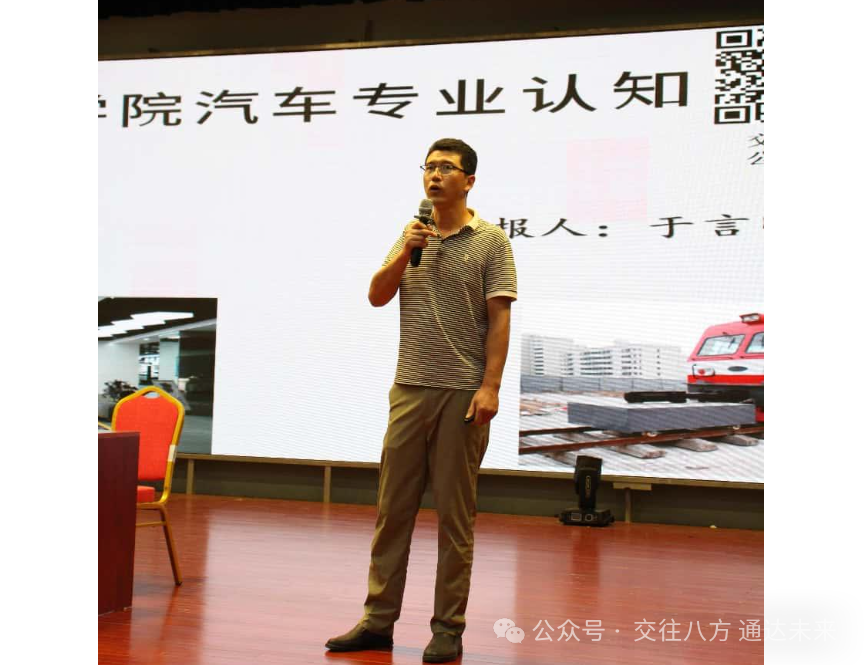 随后,汽车专业负责人于言明主任全面介绍了交通学院的整体情况。他围绕汽车类专业的设置、教学特色与发展前景,重点展示了新能源汽车实训中心的先进设备与实战化教学模式,凸显学院“产教融合、实践育人”的办学优势。于主任还详细解读了职业技能考试路径、学生社团建设、专业赛事参与及科研创新成果,并分享了优秀毕业生的高质量就业案例,为新生提供了切实可行的职业发展参考。