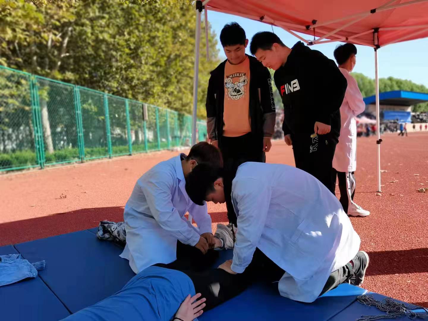 在刚刚结束的主校区2021年秋季田径运动会上,令人难忘的有奔向终点线的运动员,有公正评判的裁判,也有热情服务的志愿者们。不过在赛场旁边,还有一群社团成员,利用他们的专业知识和技术,为参加比赛的运动员们提供体能康复的保障。这就是来自医学护理学院的康养社团成员们。