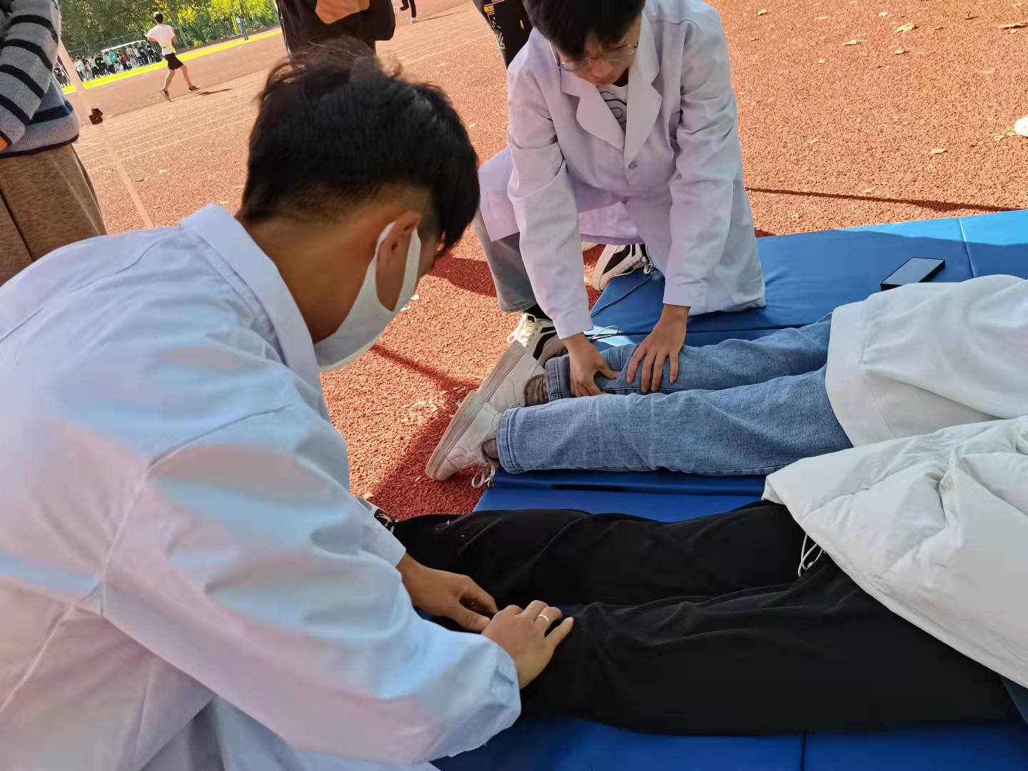 在体能康复现场,康养社团的成员们在按摩垫上,通过推拿、按摩,使参加完长跑比赛项目的运动员们肌肉得到放松、缓解体力疲劳。面对每一位前来接受康复的运动员,社团成员们都细心询问运动员状况,根据运动员的不同情况选择不同的缓解方法,让运动员们的体能得到更好恢复。